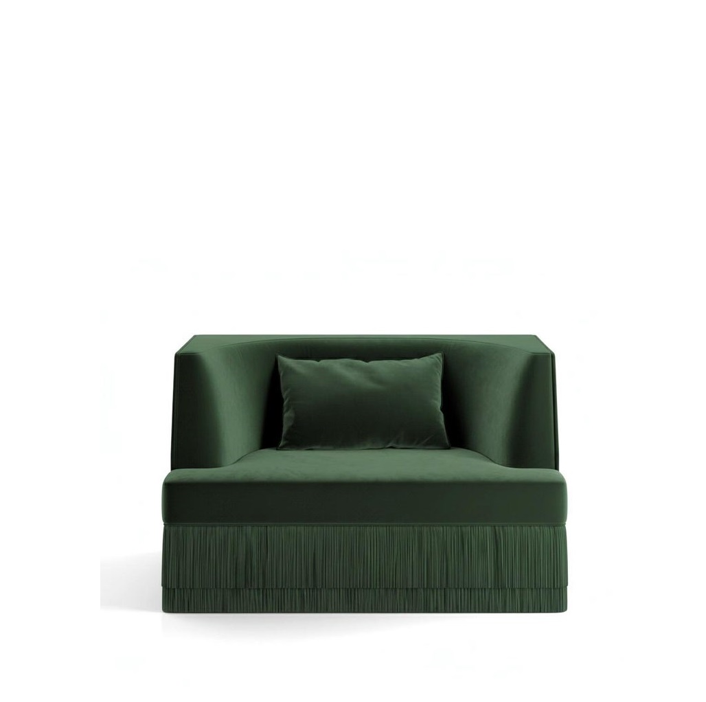 A sculptural statement piece defined by its architectural silhouette and introspective form. The Alcove armchair embraces a bold exterior — rectangular and linear — that gently reveals a soft, concave inner curve. The design evokes the feeling of a modern-day retreat, a sanctuary carved into form, where function meets quiet sophistication. Crafted with a solid hardwood frame and high-resilience foam, this armchair offers a balance of precision and comfort. The piece is upholstered in a rich velvet fabric and accented by cascading silky fringe layers along the base, creating a dialogue between stillness and flow.