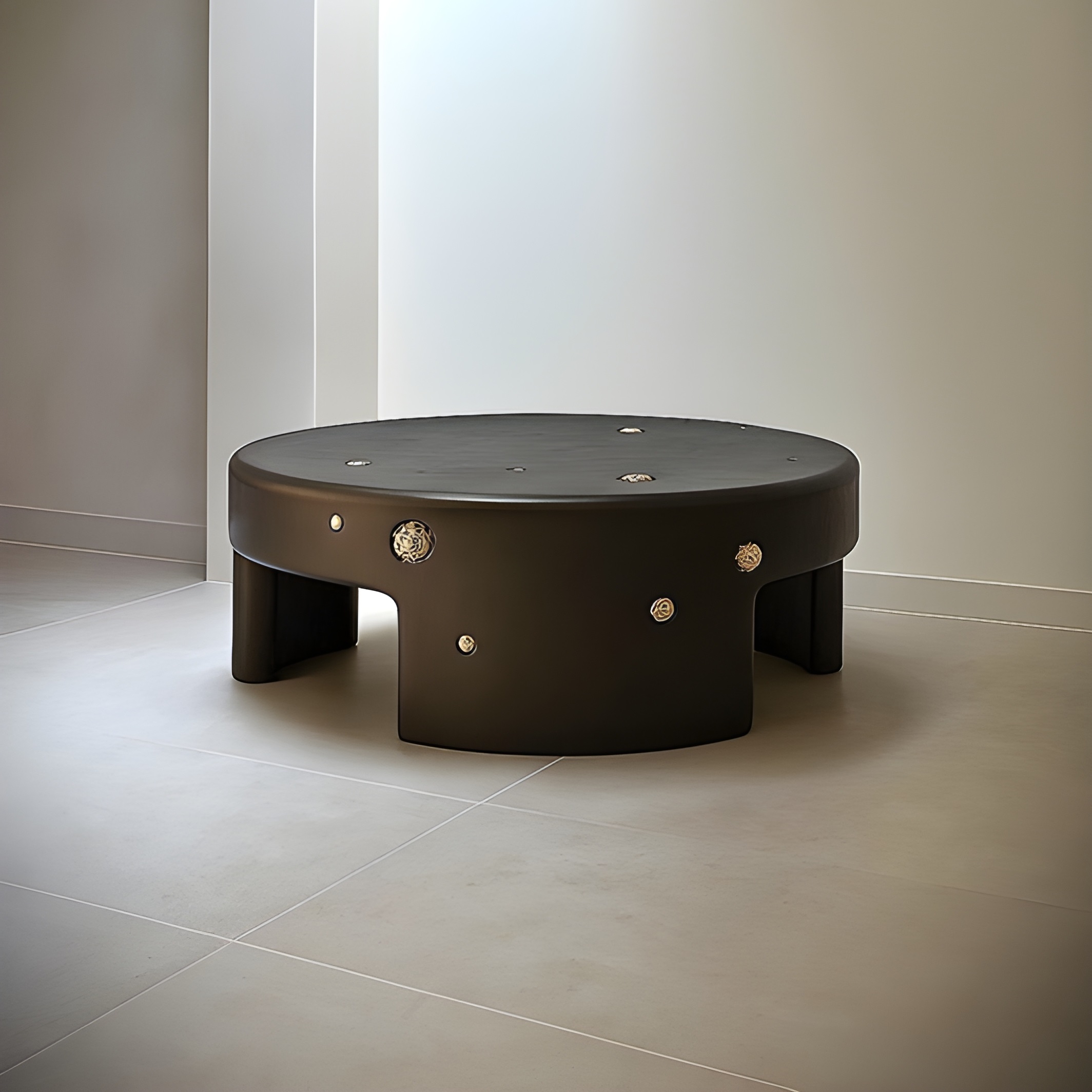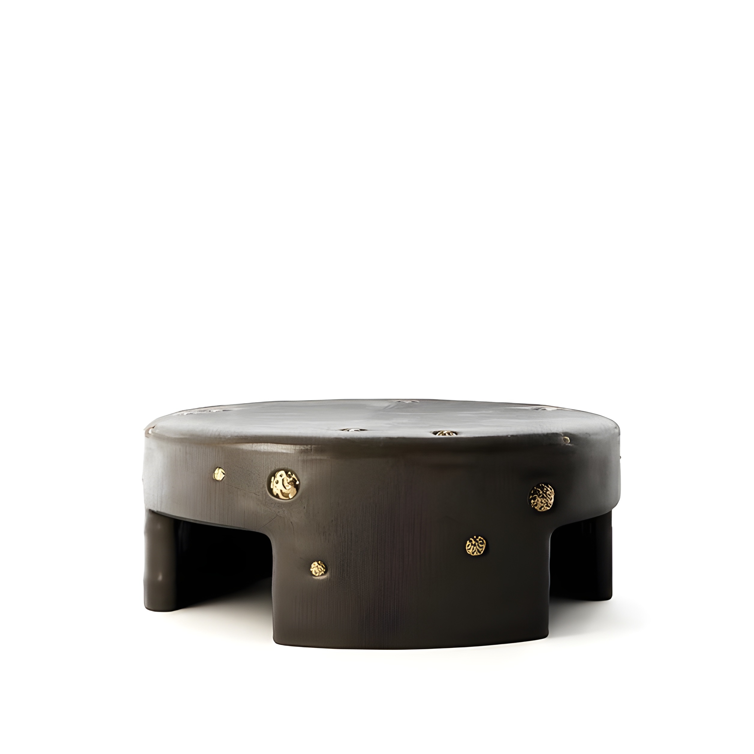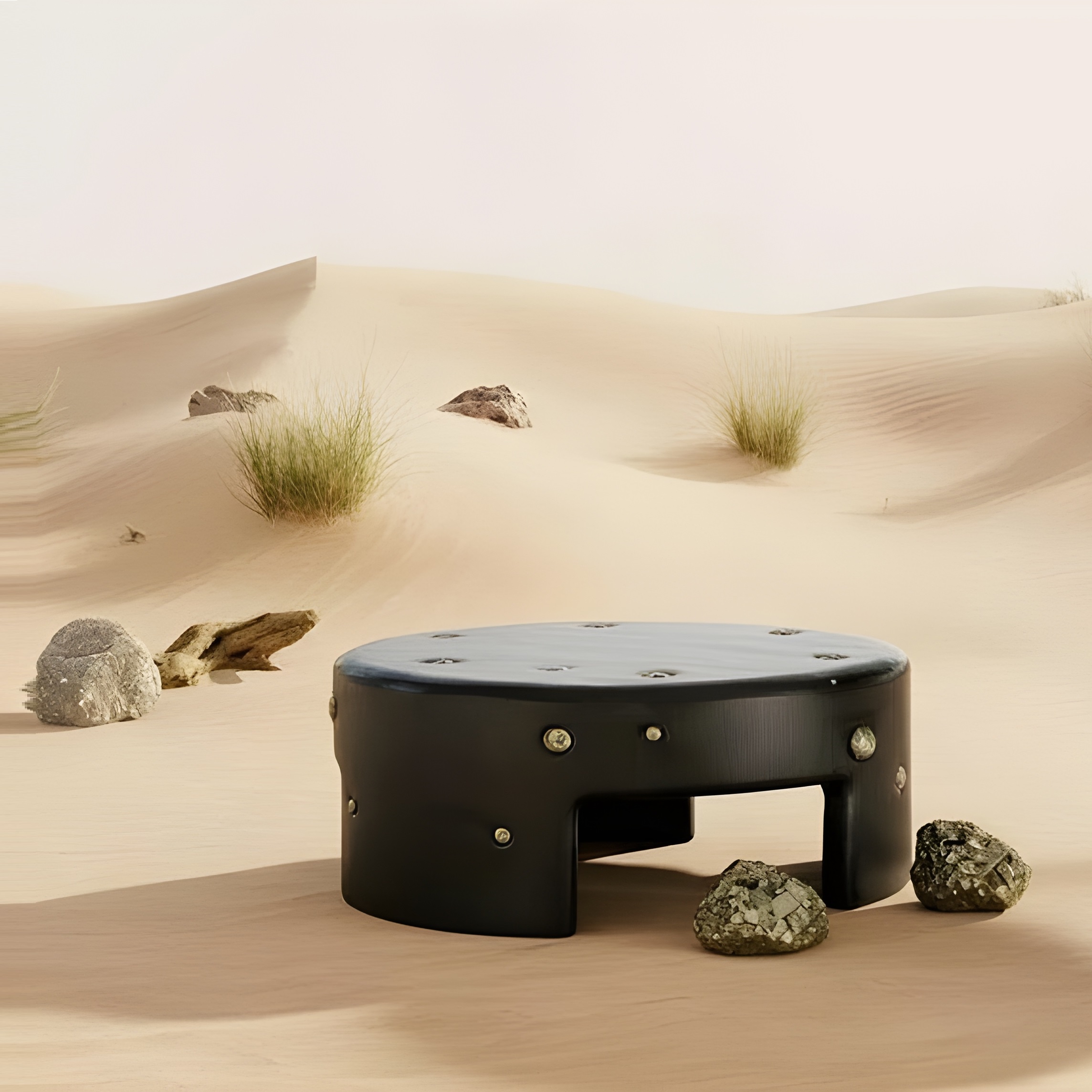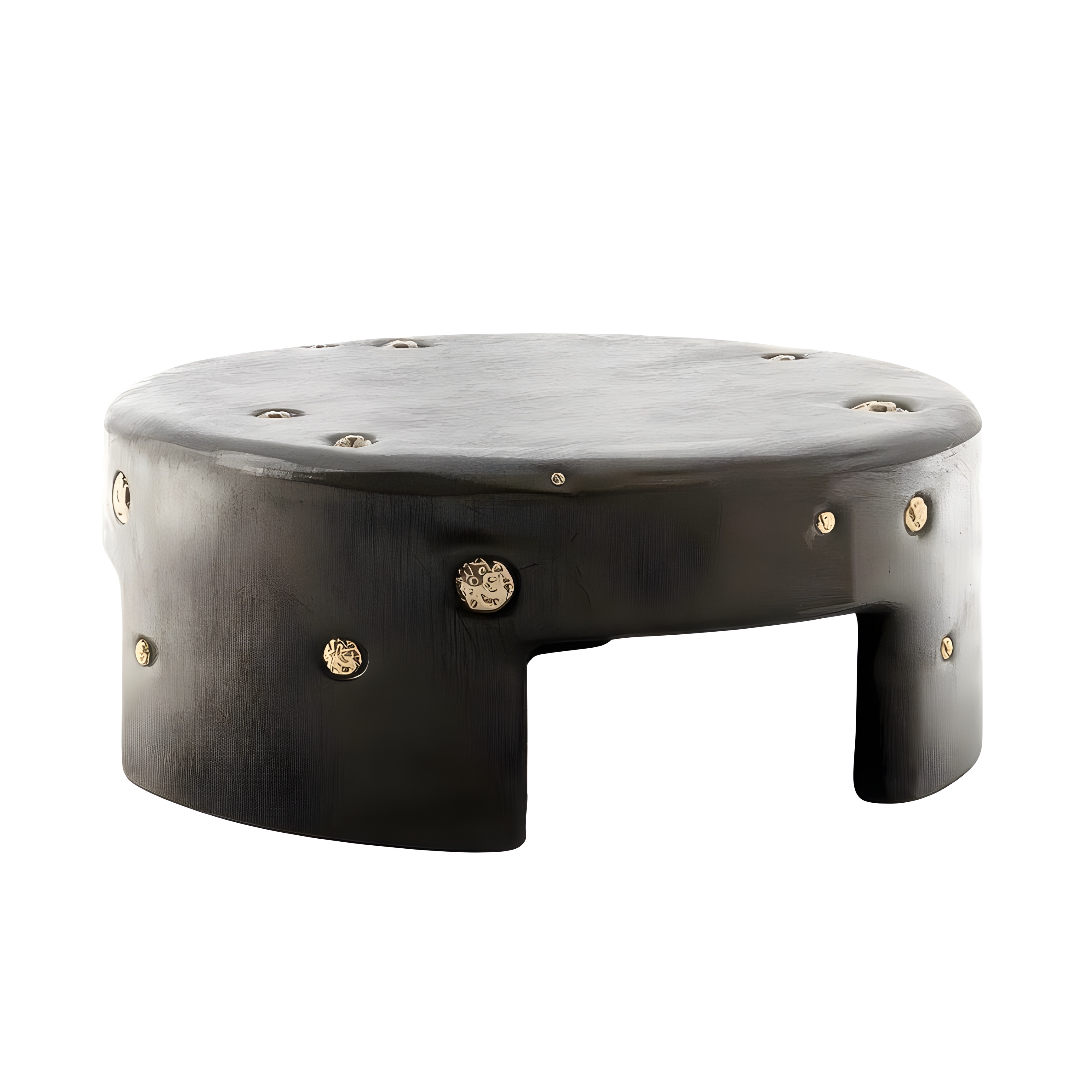 This handcrafted coffee table from the Africa Collection expresses Sidani Design’s sculptural language through a bold, monolithic silhouette enriched with mineral tactility. The piece is carved in solid wood and finished in a deep, charcoal-toned stain that enhances the grain structure while providing a refined, gallery-grade presence. The cylindrical form is punctuated by hand-set natural pyrite spheres, each individually selected and inset into carved cavities. Their metallic sheen contrasts against the darkened wood, creating a rhythmic constellation of mineral accents. Every pyrite sphere is unique, lending the table an unmistakably collectible character. The softened edges, recessed leg openings, and low, grounding posture give the piece an architectural quietness, while the crystal inclusions introduce a raw, geological energy.