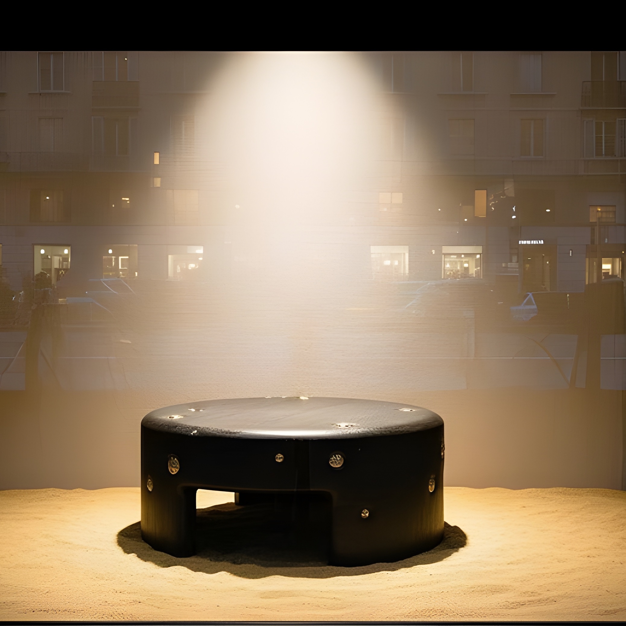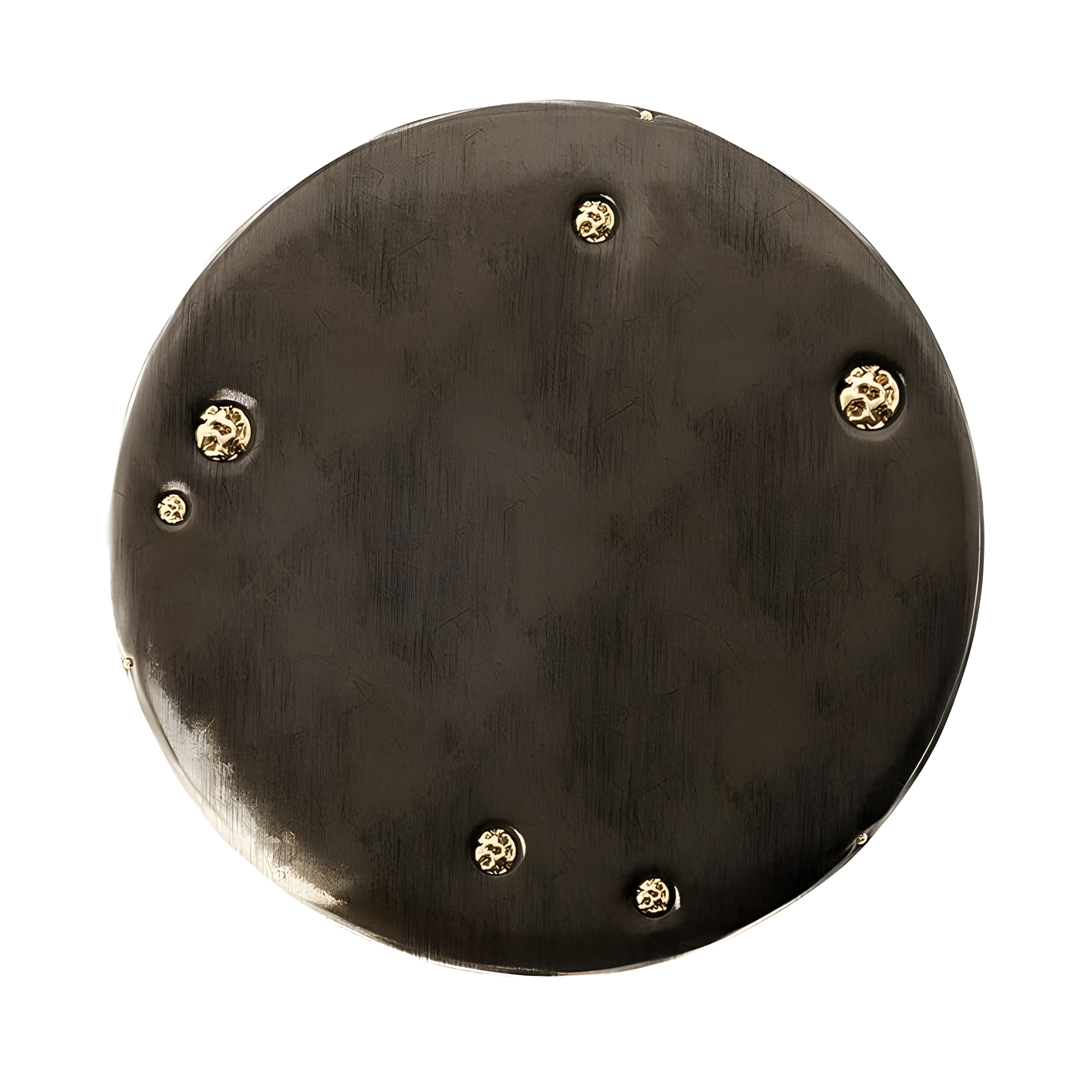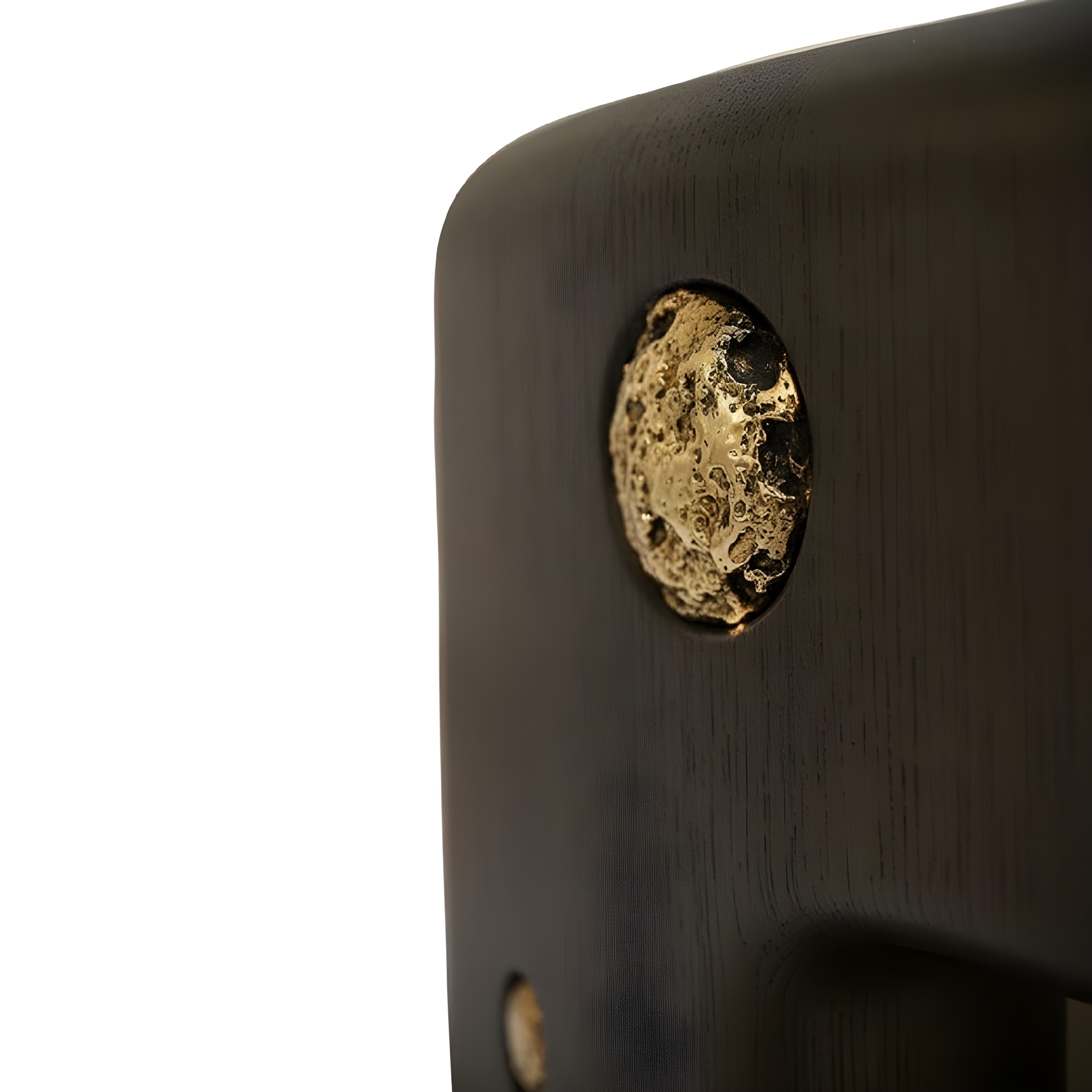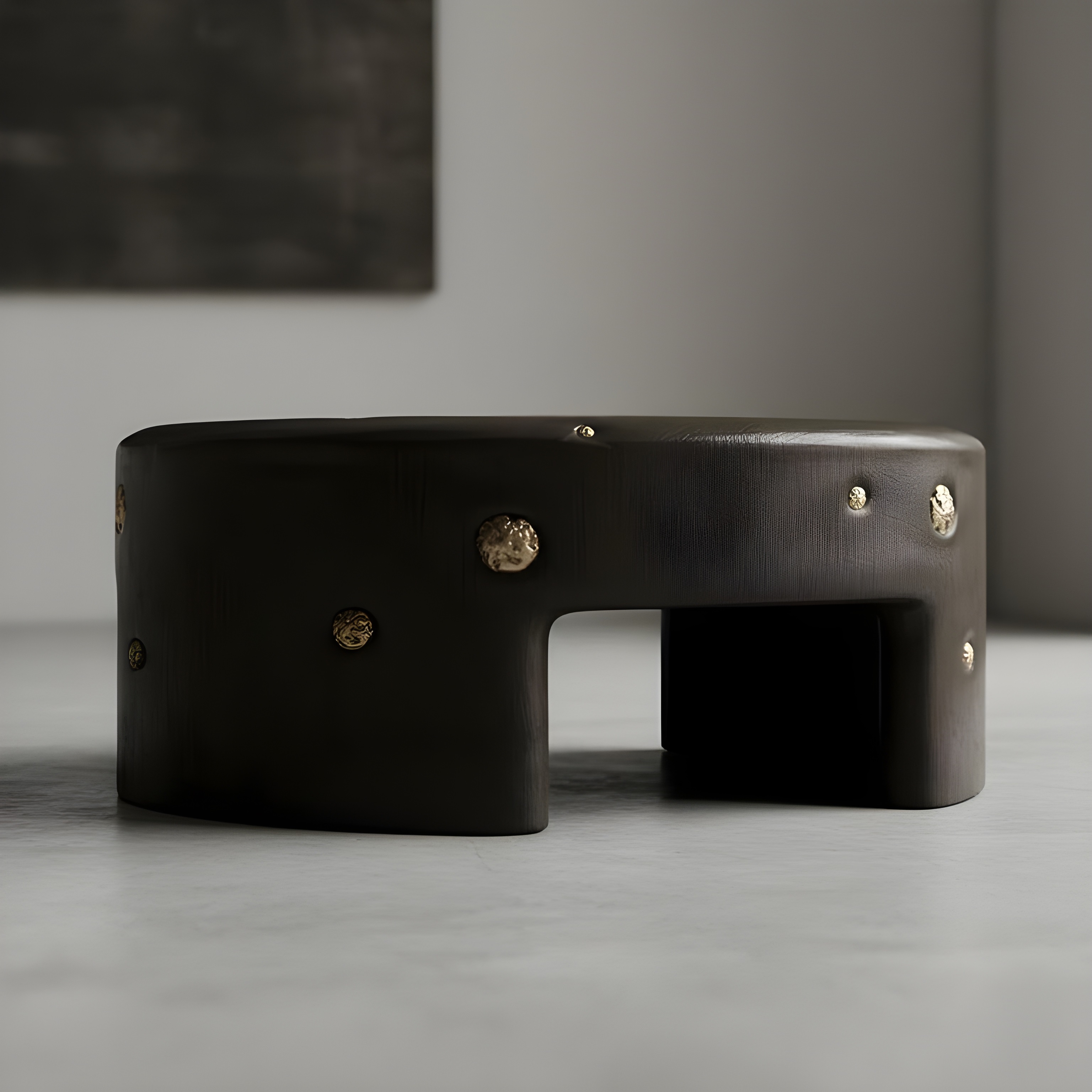 This handcrafted coffee table from the Africa Collection expresses Sidani Design’s sculptural language through a bold, monolithic silhouette enriched with mineral tactility. The piece is carved in solid wood and finished in a deep, charcoal-toned stain that enhances the grain structure while providing a refined, gallery-grade presence. The cylindrical form is punctuated by hand-set natural pyrite spheres, each individually selected and inset into carved cavities. Their metallic sheen contrasts against the darkened wood, creating a rhythmic constellation of mineral accents. Every pyrite sphere is unique, lending the table an unmistakably collectible character. The softened edges, recessed leg openings, and low, grounding posture give the piece an architectural quietness, while the crystal inclusions introduce a raw, geological energy.