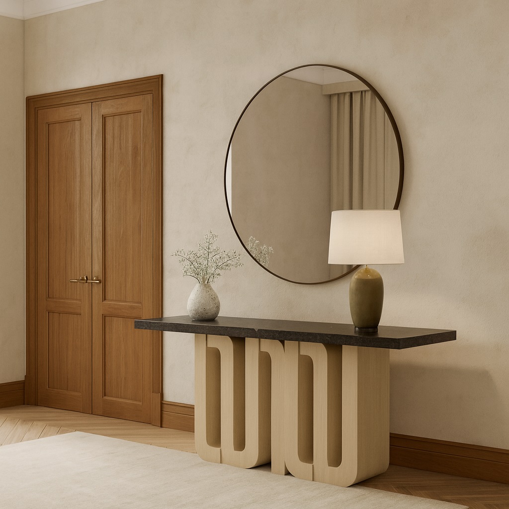 This modern and elegant console table is a beautiful combination of natural materials. The expansive top is crafted from Macassar stone, which is given a brilliant polished finish to highlight its unique patterns and natural luster. The table's substantial structure is made from oak wood, which is treated with a limed finish. This technique gives the wood a subtle, weathered appearance, accentuating its natural grain and adding a soft, textured contrast to the smooth, polished stone top. The blend of the cool, polished stone and the warm, textured wood creates a sophisticated and timeless piece.
