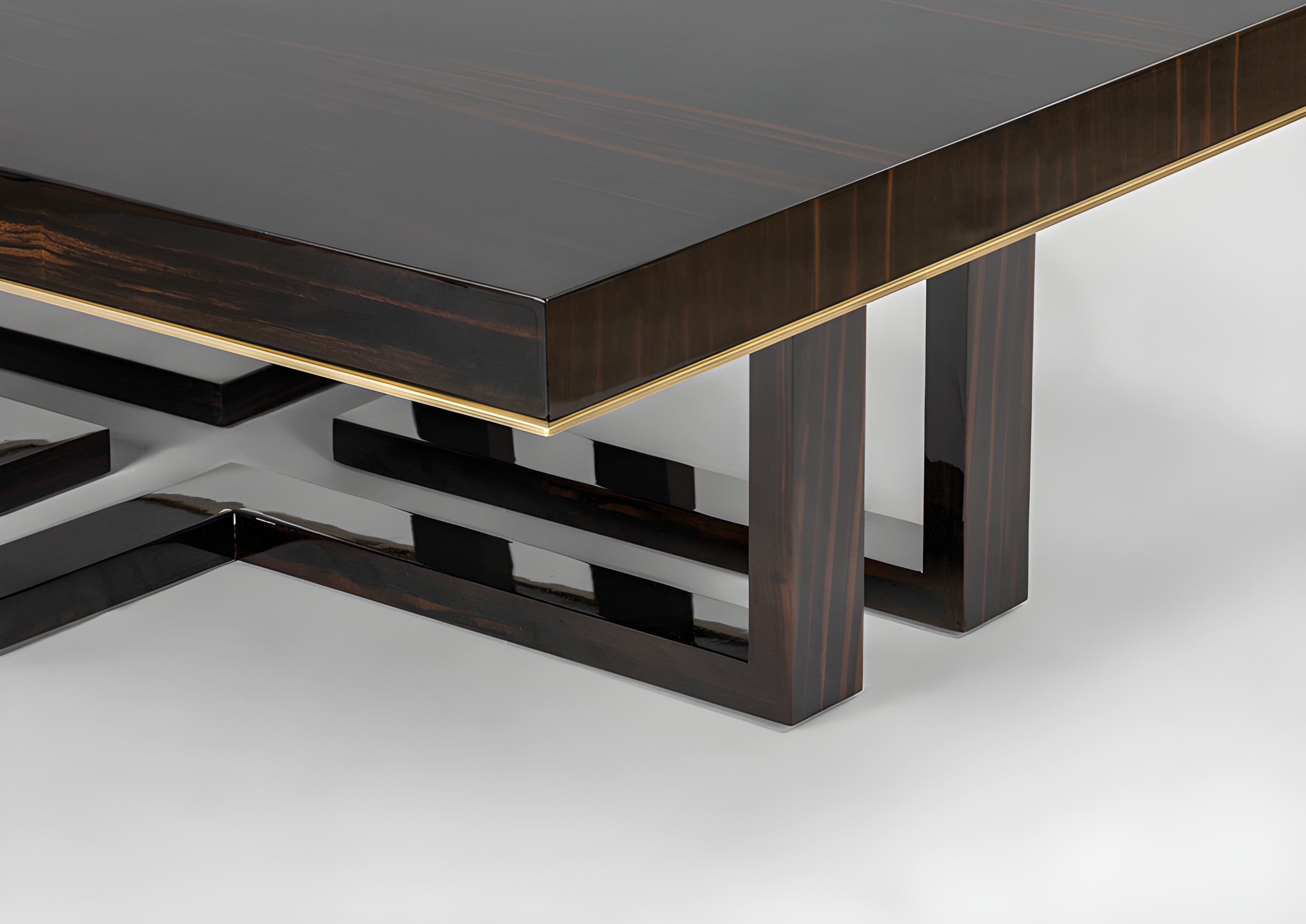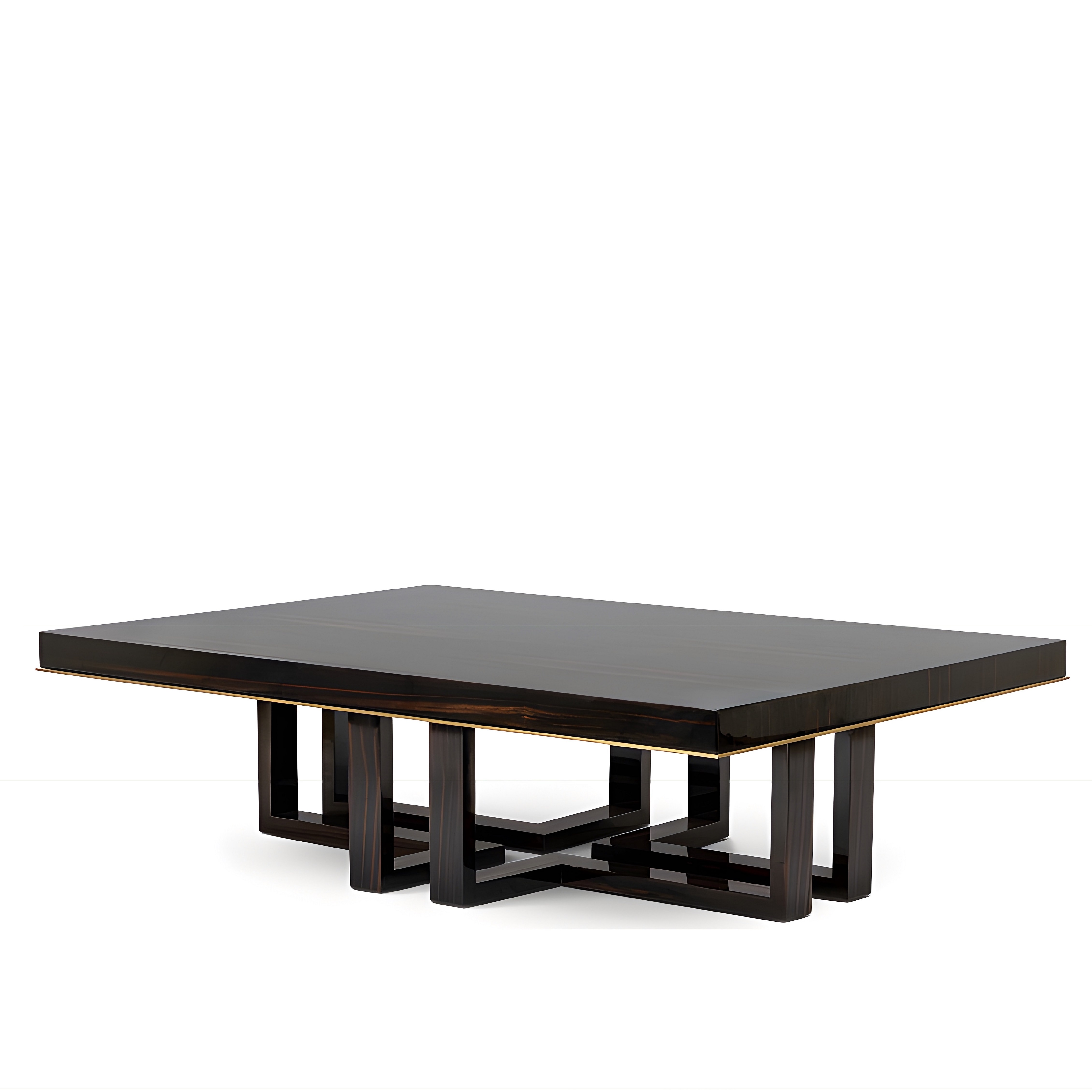 The Amácia coffee table blends the sleek allure of high-gloss ebony wood with the refined elegance of an oxidized french brass rim. Its base is an elegant dance of intersecting legs, creating a harmonious interplay of form and void. The purposeful gaps at the center evoke a cross-like shape, where the space itself becomes part of the design, offering both balance and a captivating visual rhythm.