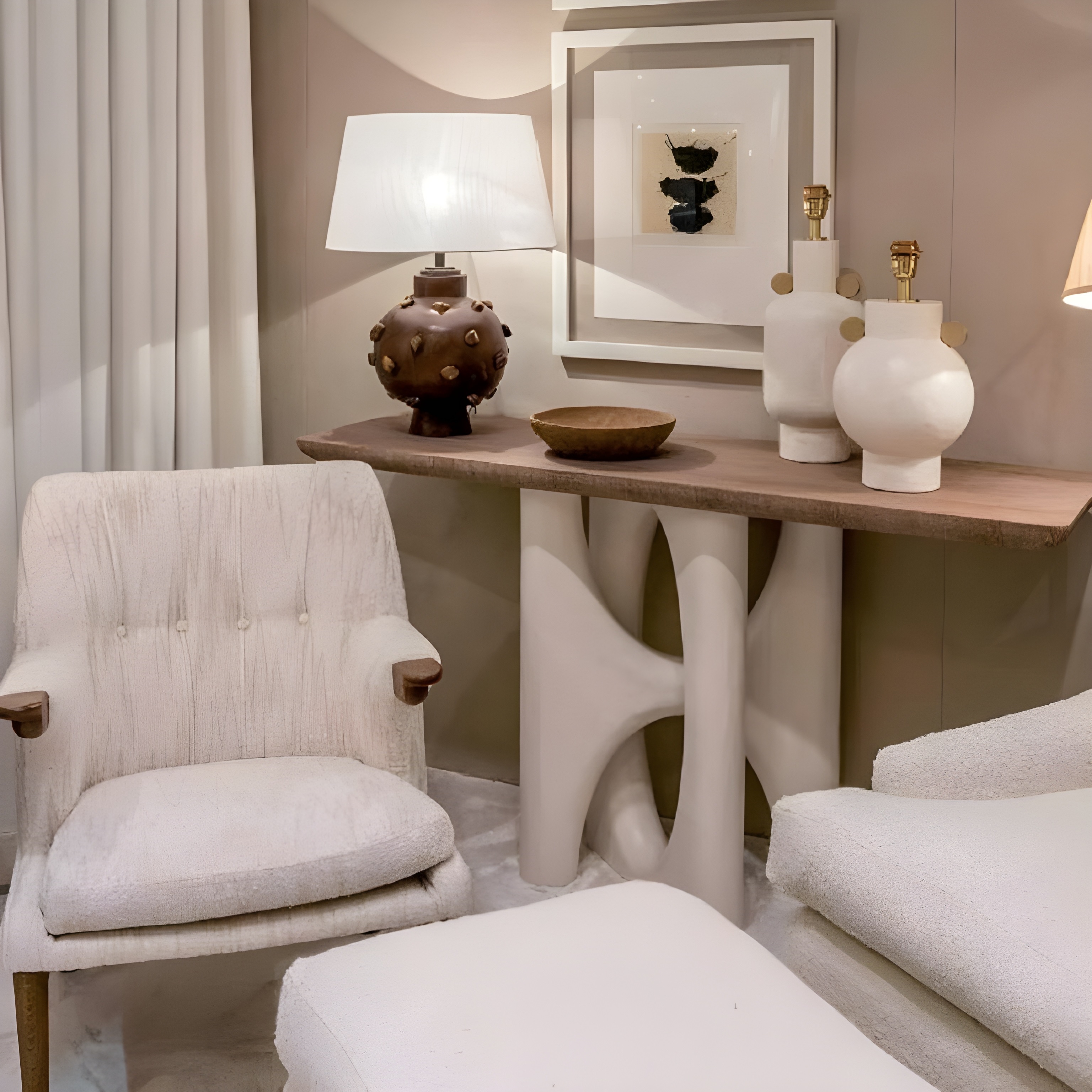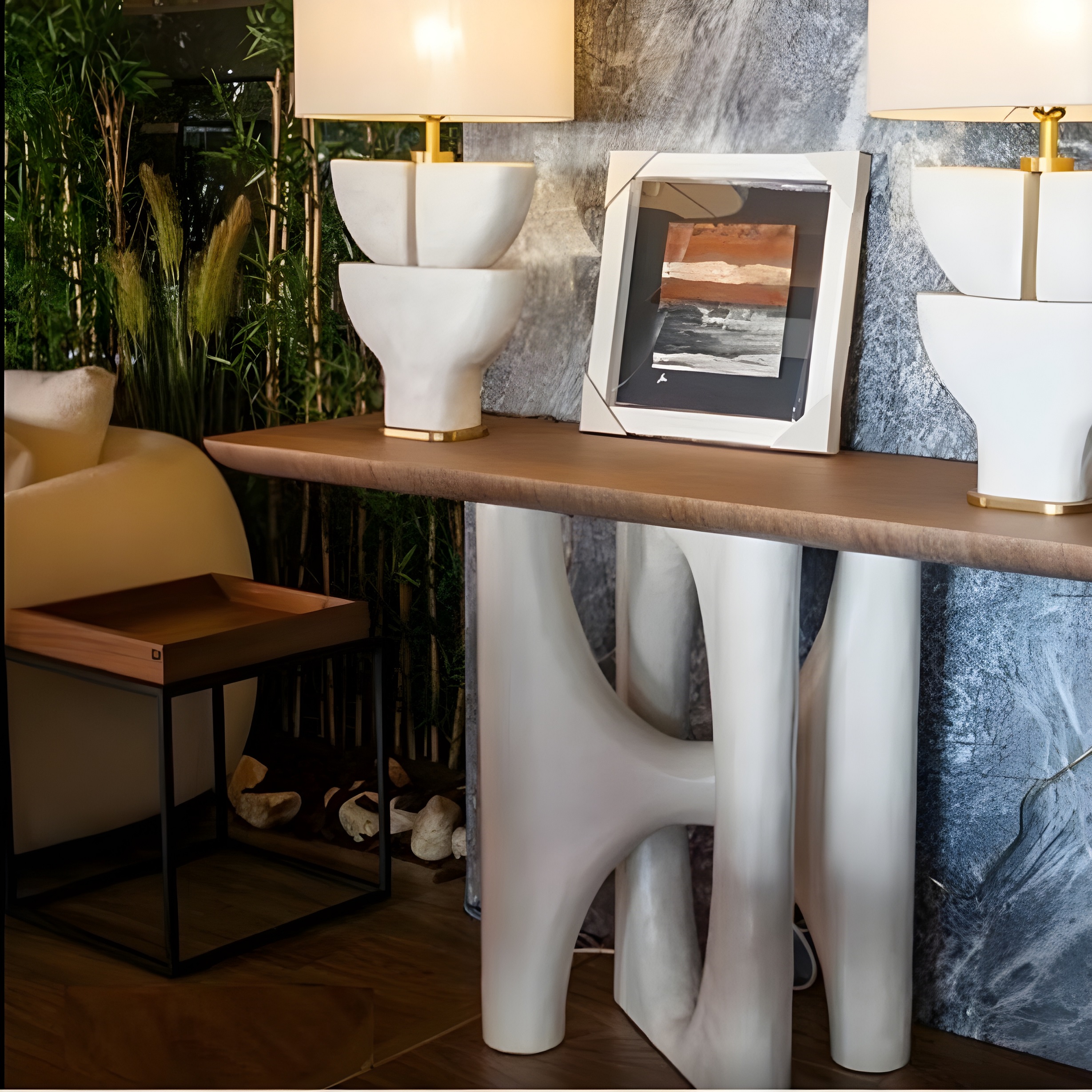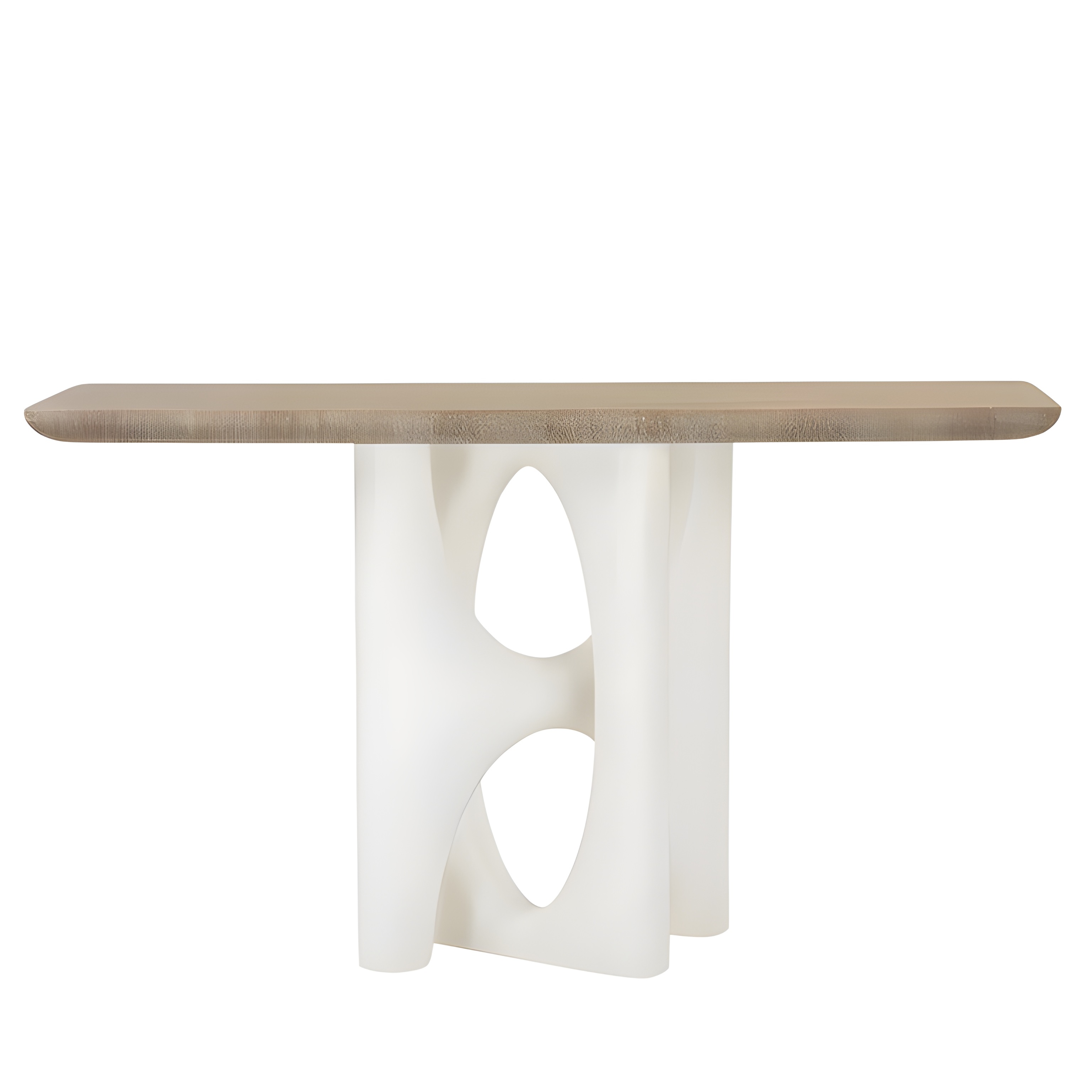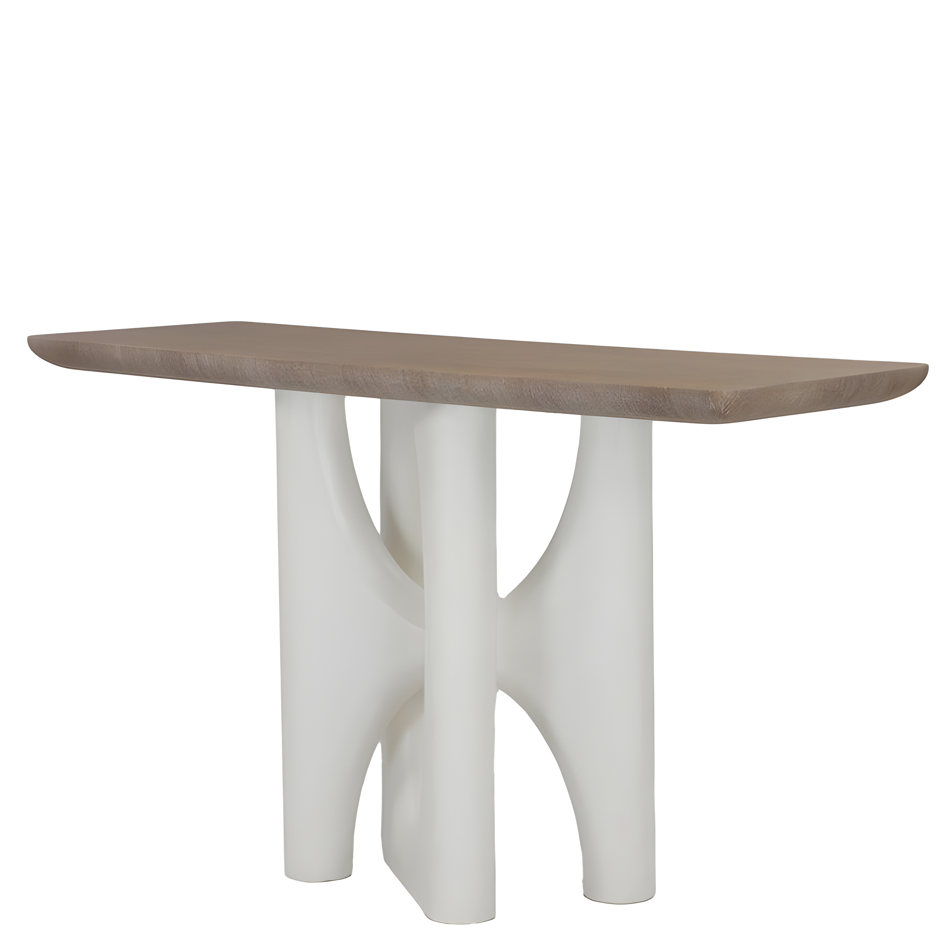 This console is characterized by a unique and artistic design that brings together various elements to create a distinctive piece of furniture. The legs of the console are crafted from plaster, and the intertwining pattern adds a sense of texture and visual interest. The tabletop is made of oak wood, featuring a rectangular shape that softens the overall silhouette of the console.