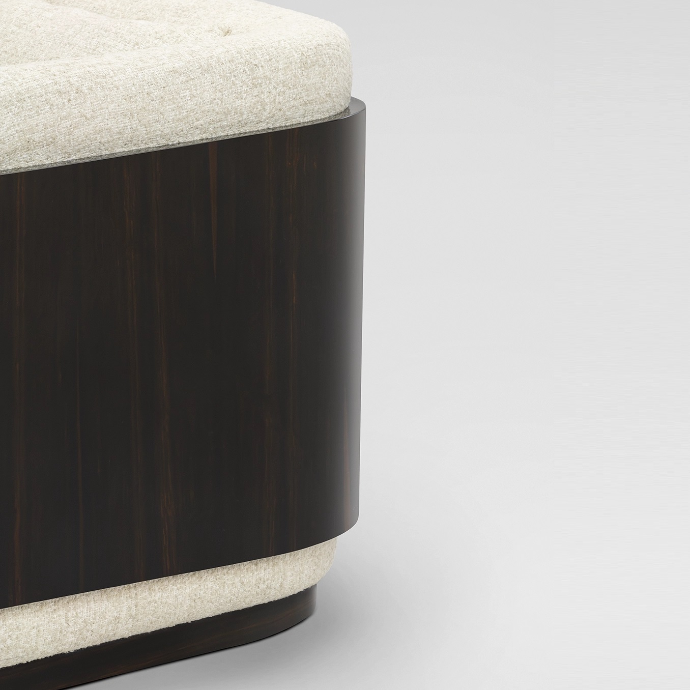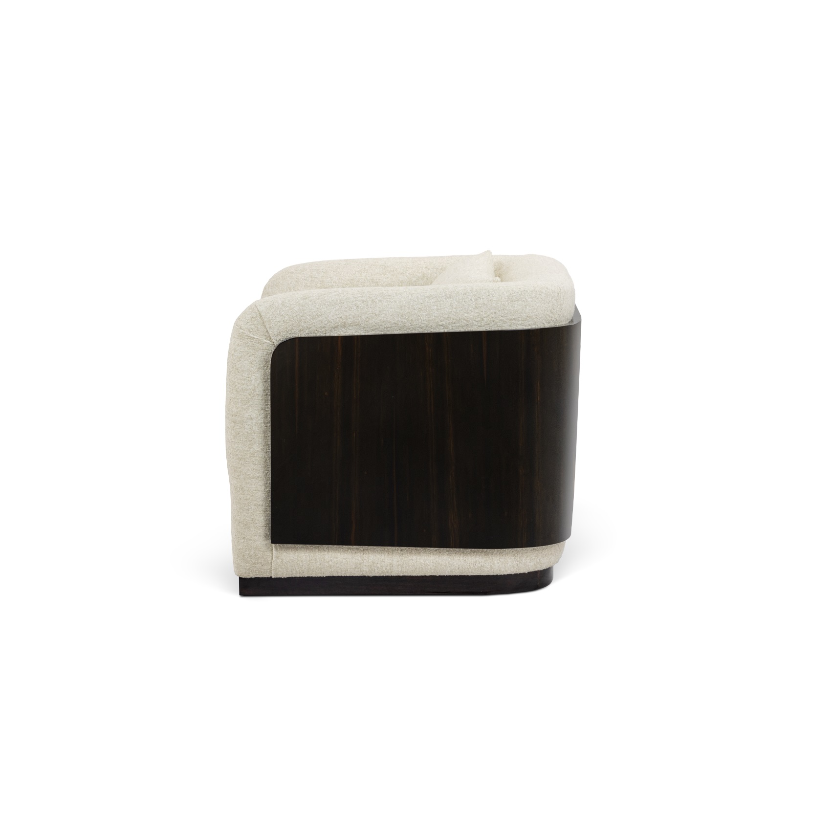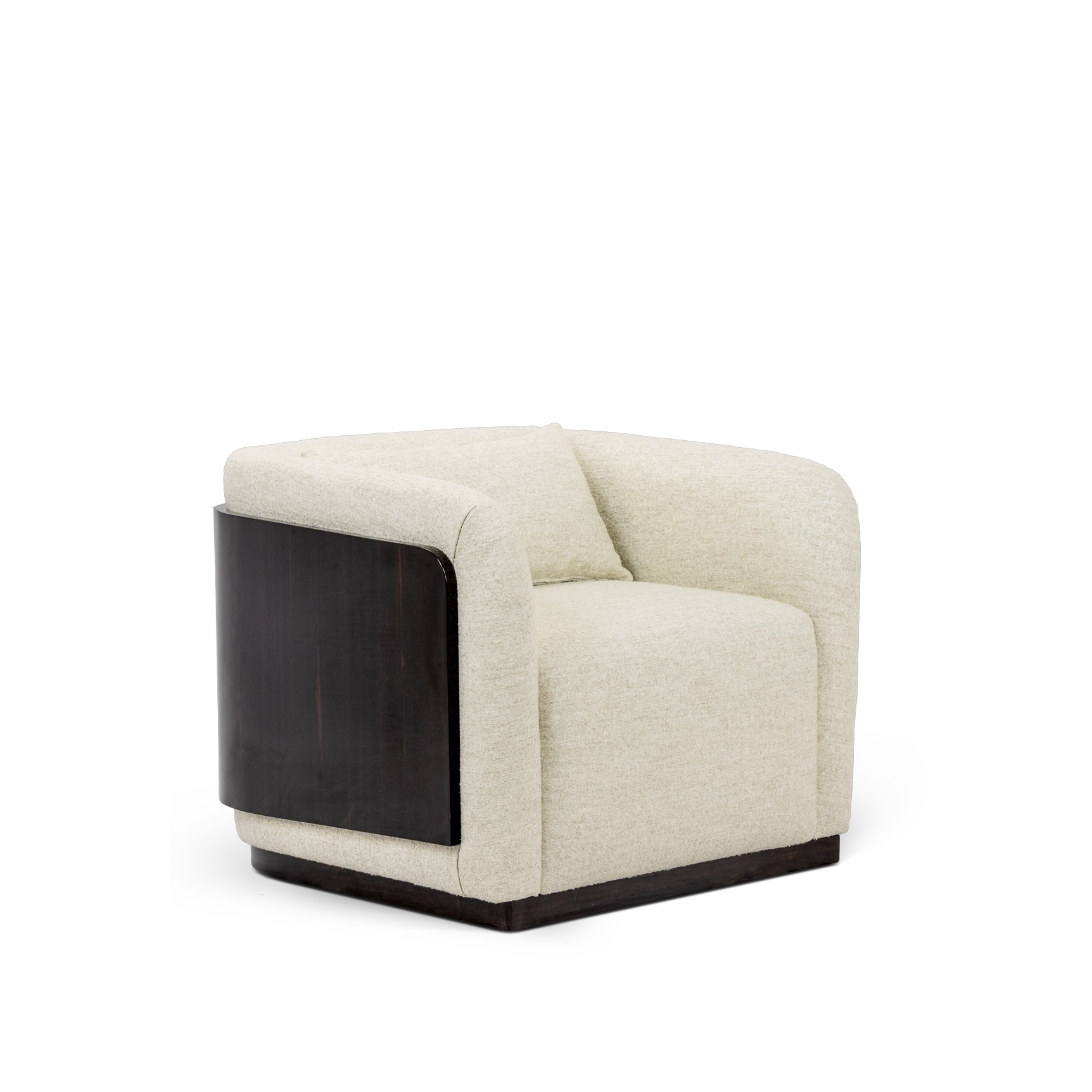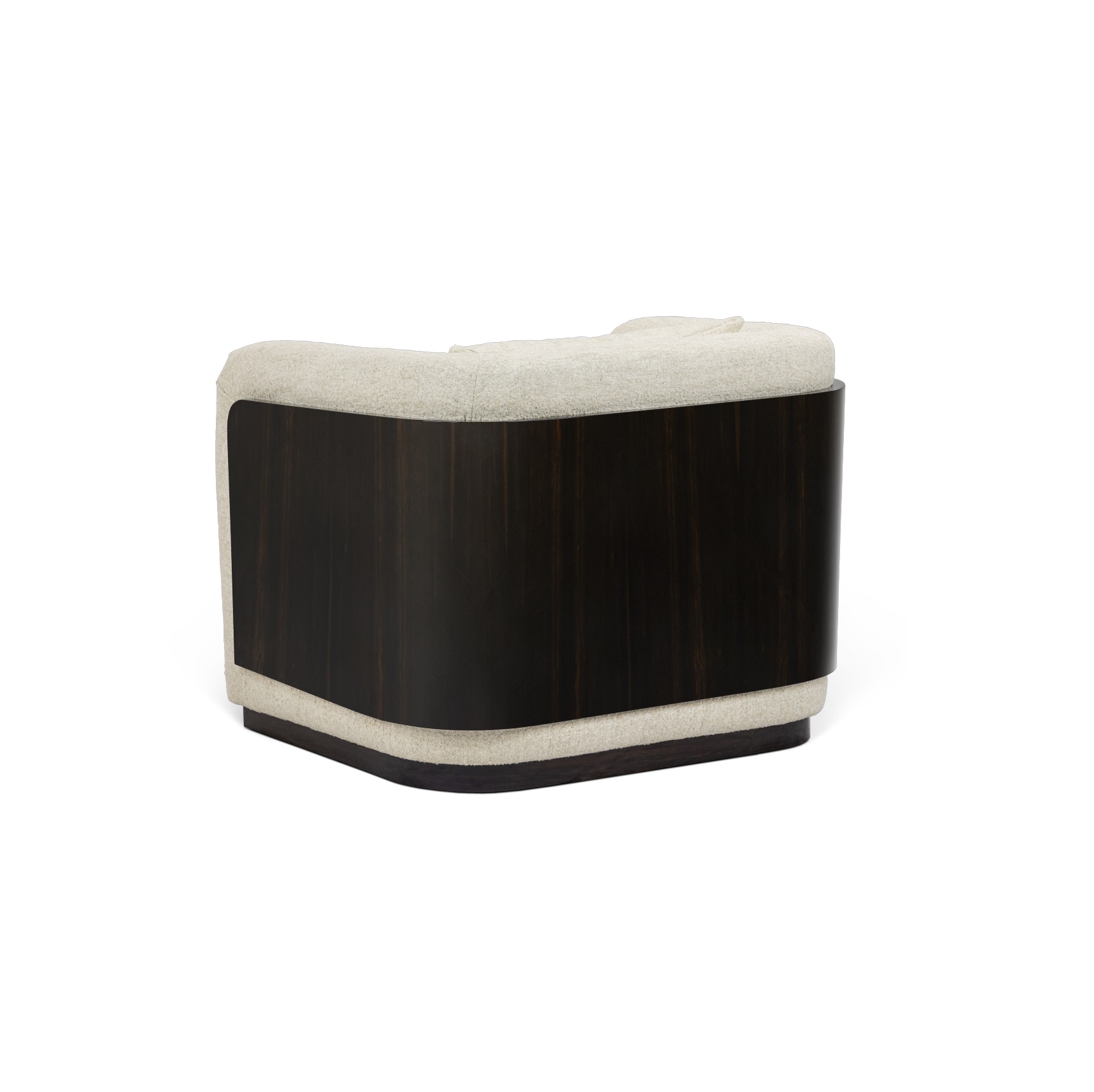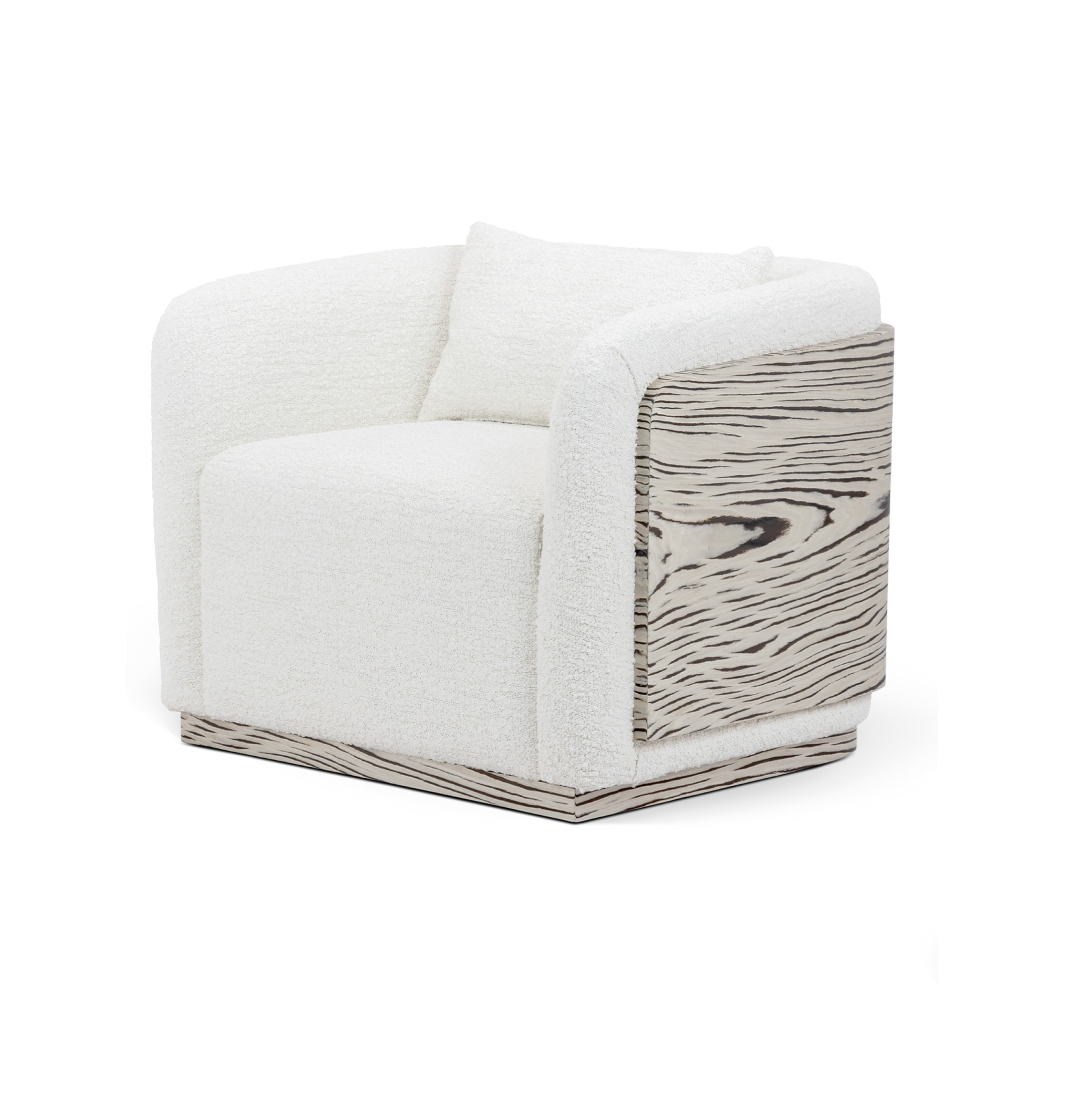 The Bari swivel armchair artfully balances sculptural strength with inviting comfort, featuring a curved backrest available in two distinct timber personalities: rich ebony wood with a sophisticated high-gloss finish, or white zebra wood with a natural finish for a vibrant, graphic aesthetic. This architectural woodwork is beautifully softened by the gentle, rounded edges of the upholstered seat, creating a compelling material contrast that is both bold and welcoming.