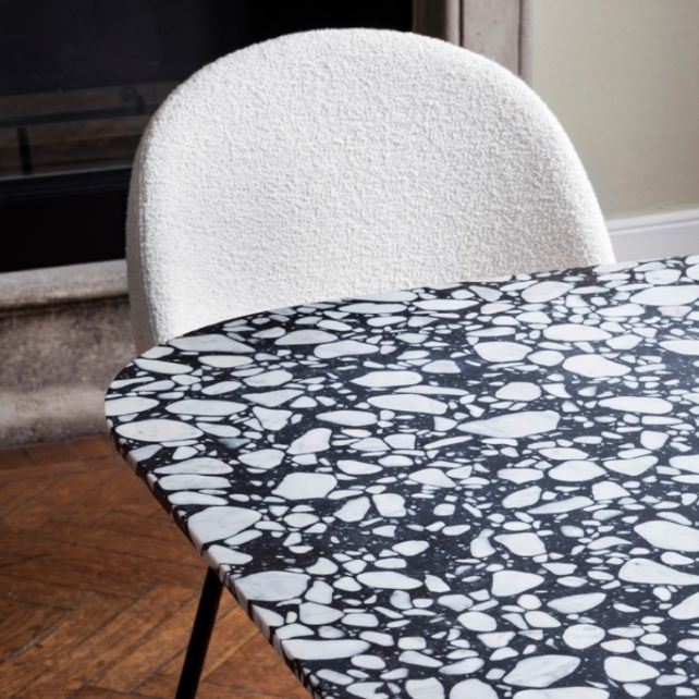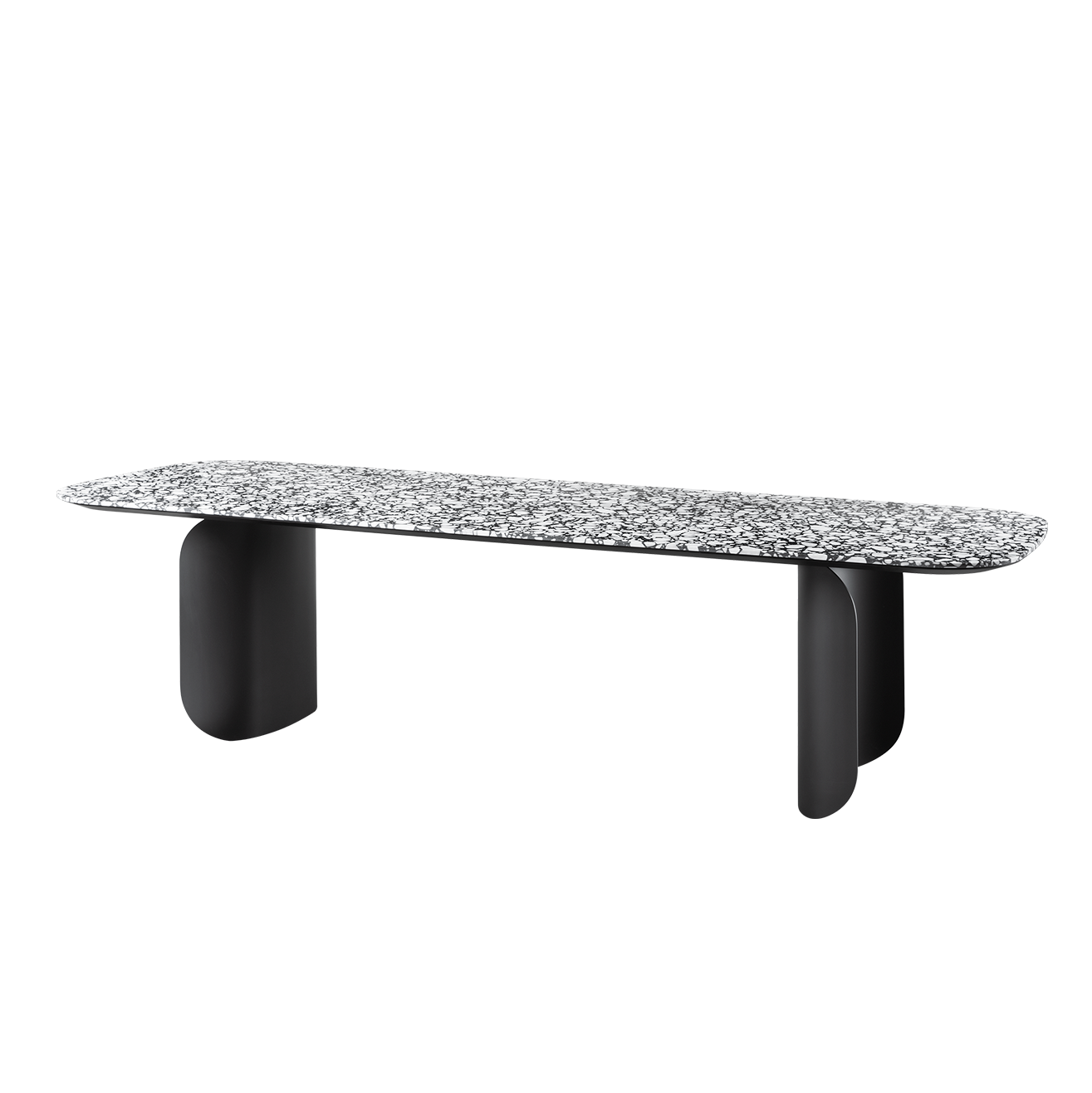 Tabletop is offered in lacquer, wood, ceramic or marble with metal legs.