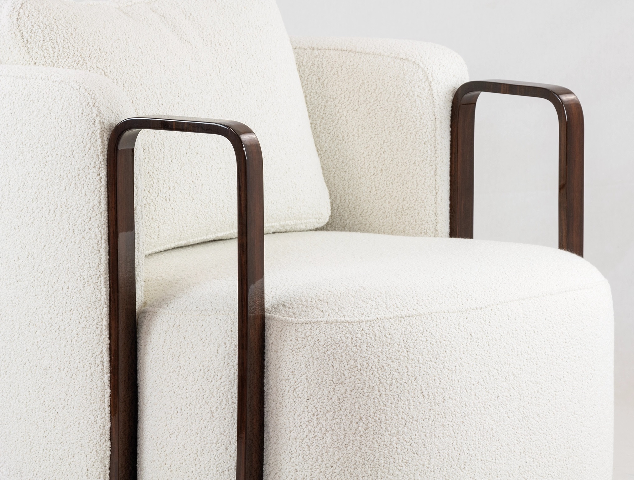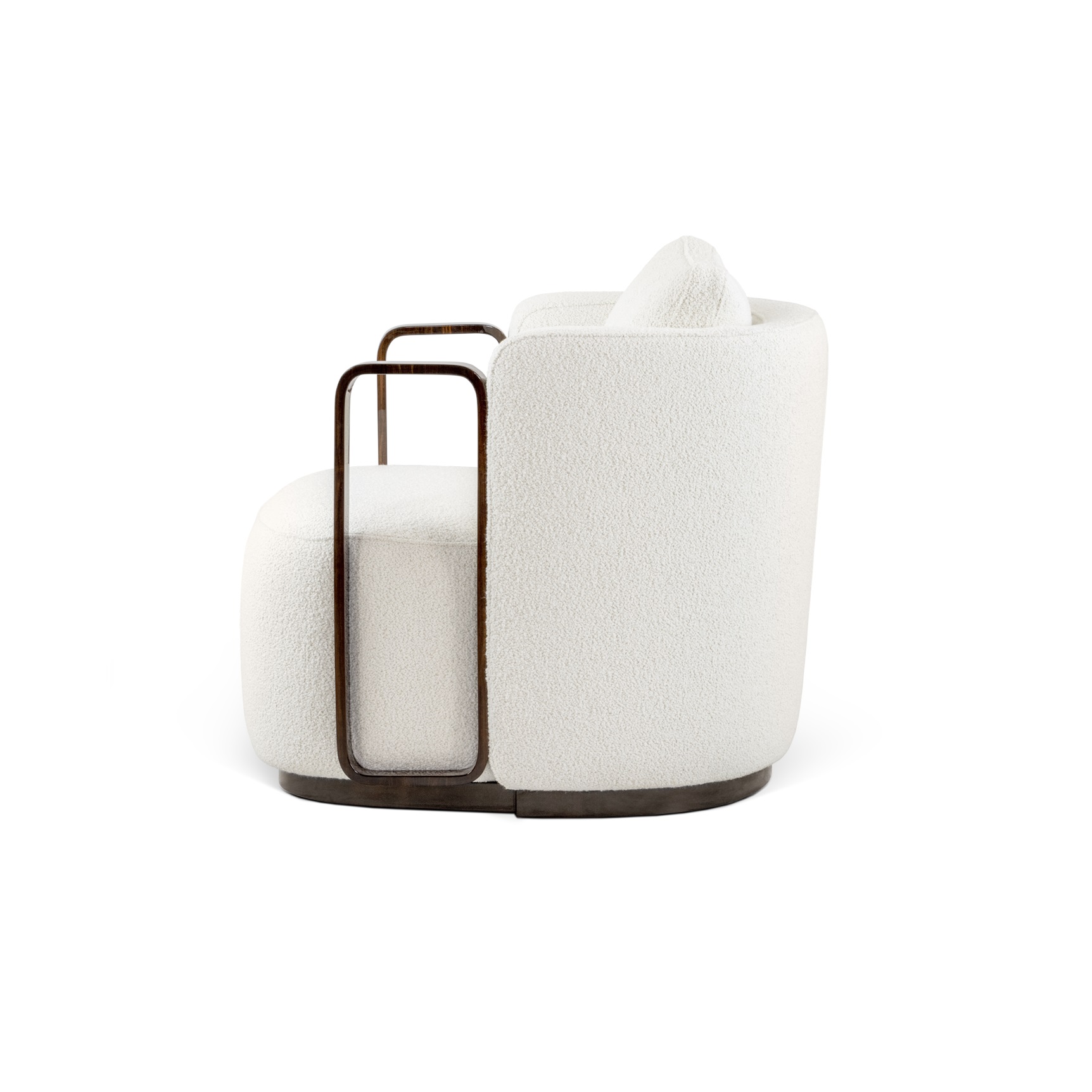 This swivel armchair is a sophisticated marriage of sculptural woodwork and plush comfort, designed to serve as a high-end statement piece. The chair features striking, architectural armrests crafted from rich ebony wood with a mirror-like high-gloss finish, creating dark wood elements that wrap around the sides in a sleek, rectangular loop for a bold geometric silhouette. This continuous flow contrasts beautifully with the soft upholstery, while the entire piece is grounded by a recessed swivel plinth base, also finished in matching high-gloss ebony, which allows for effortless 360-degree movement.