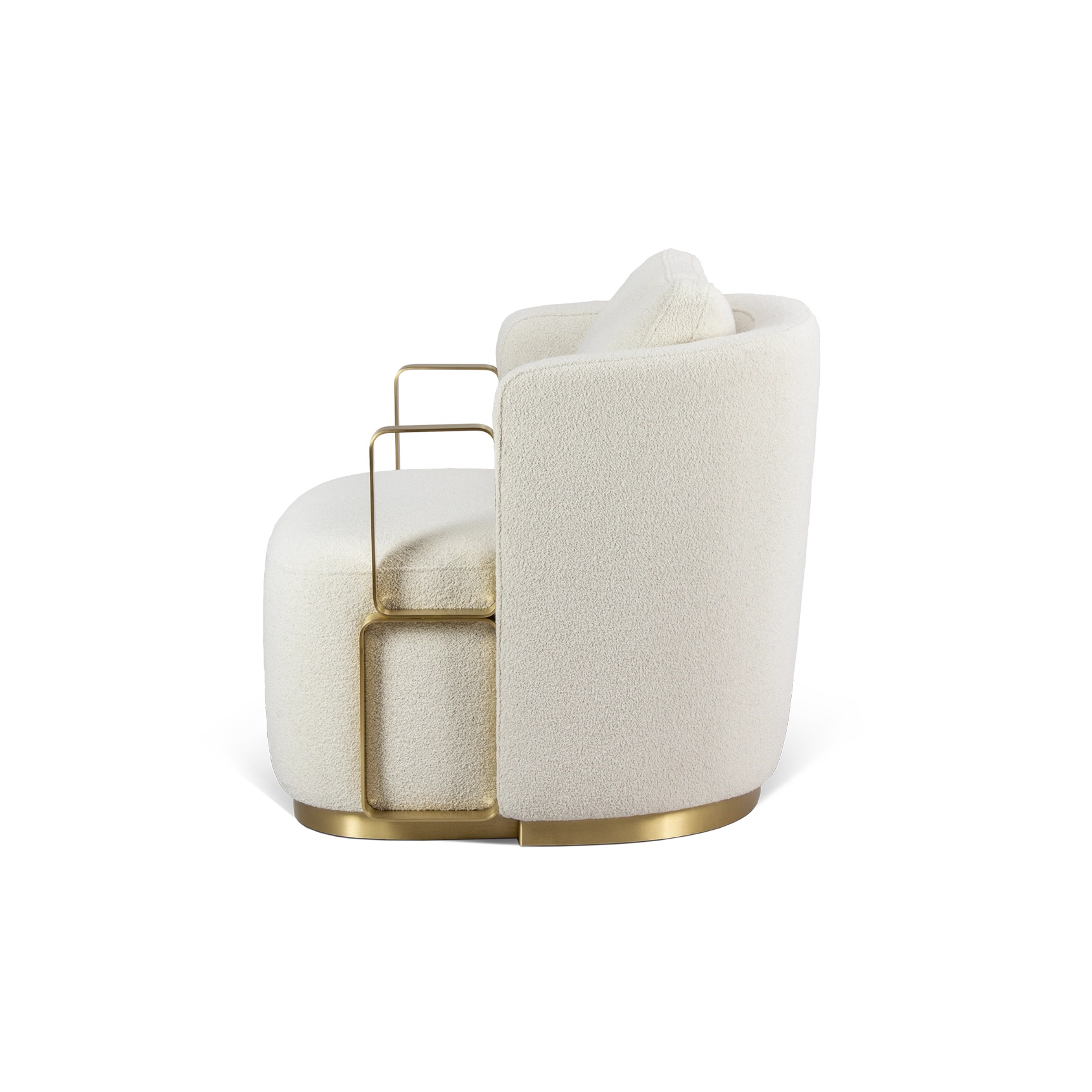 This swivel armchair is a sophisticated marriage of sculptural metalwork and plush comfort, designed to serve as a high-end statement piece. The design features striking, architectural armrests crafted from metal with a refined brass finish that wrap around the sides in a sleek, rectangular double-loop configuration. This creates a bold geometric profile that offers a sharp contrast to the soft upholstery, while the entire piece is grounded by a recessed swivel plinth base, also finished in matching brass, which allows for effortless 360-degree movement.