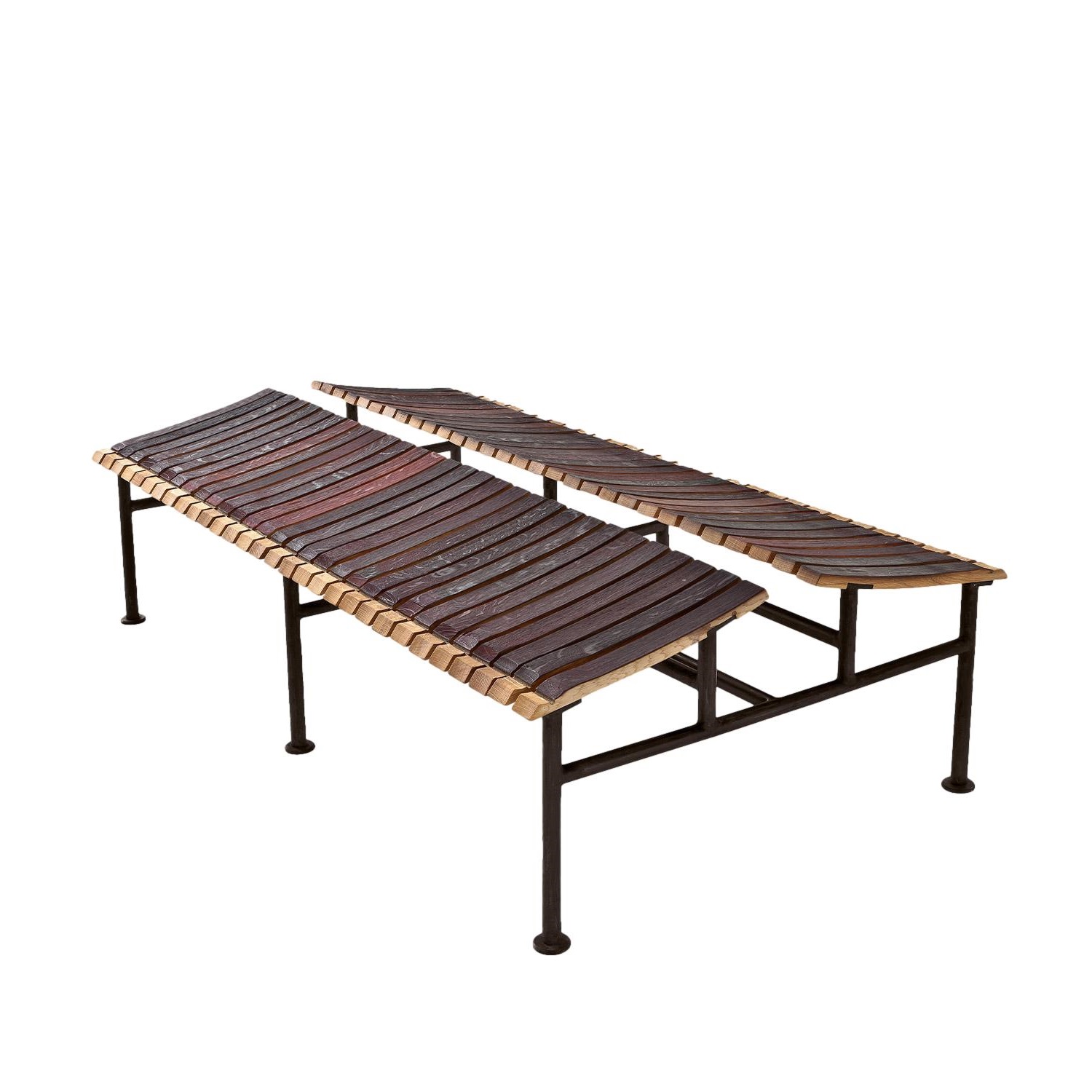 Bench with double inclined seat, made of wooden slats from Barrique, combined with an iron frame.