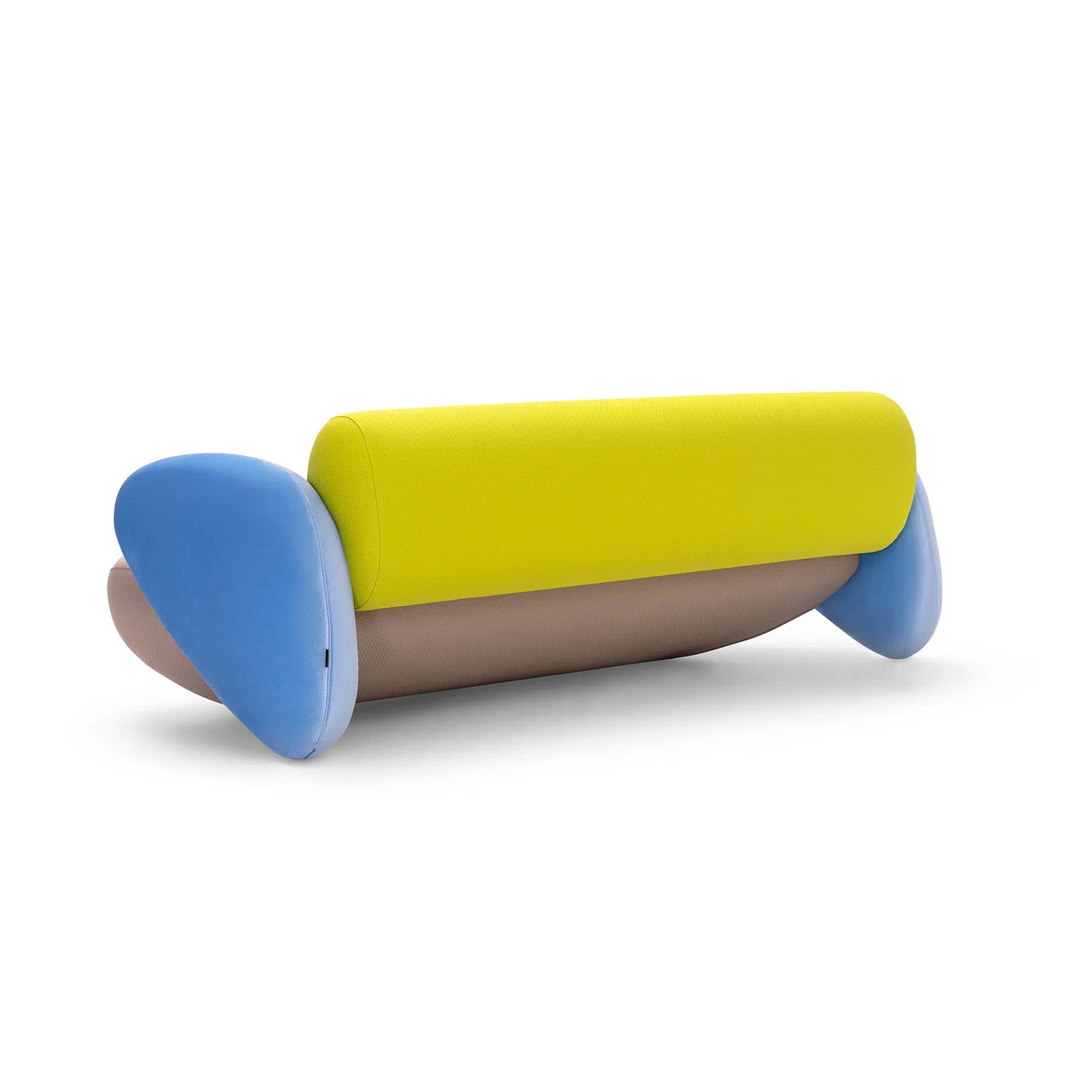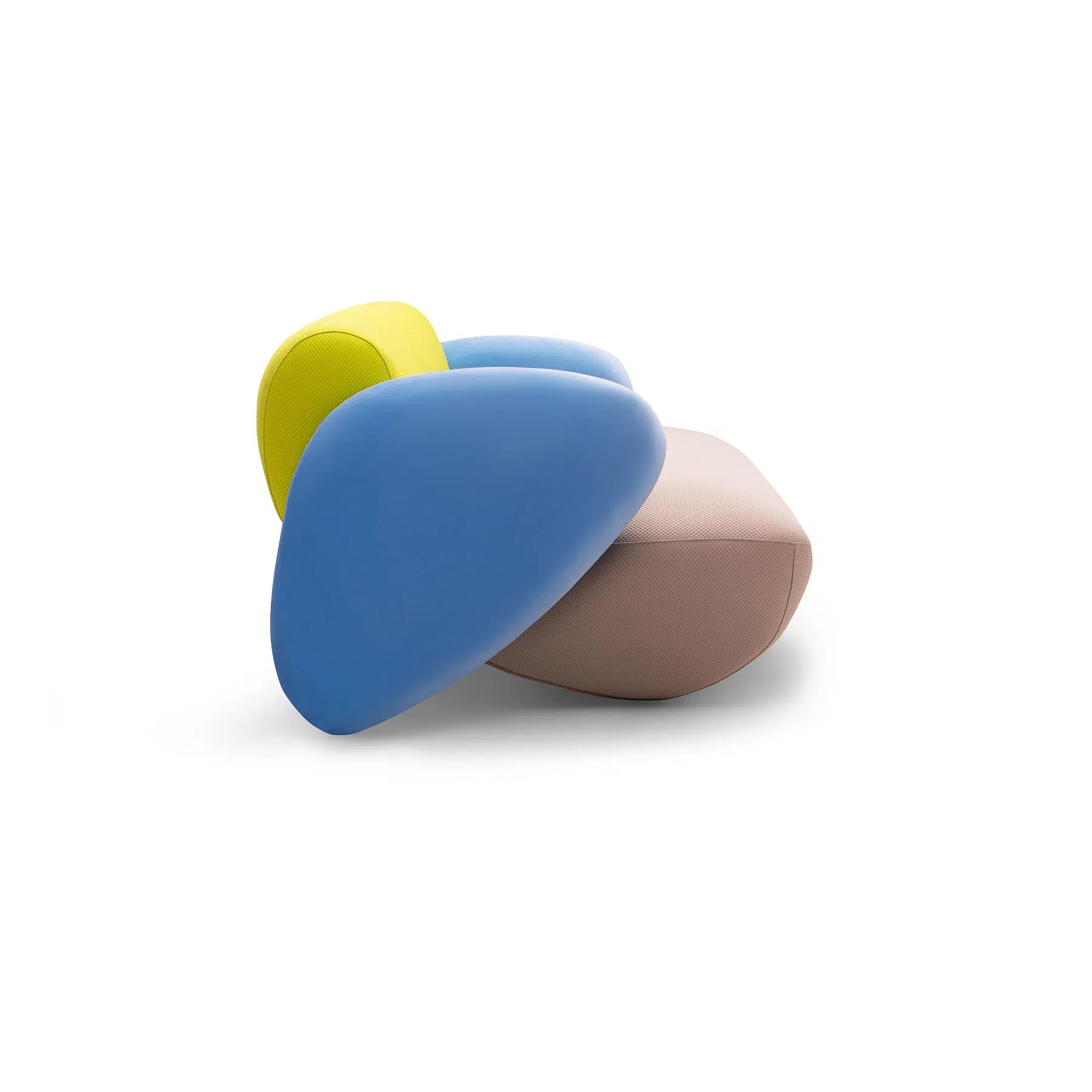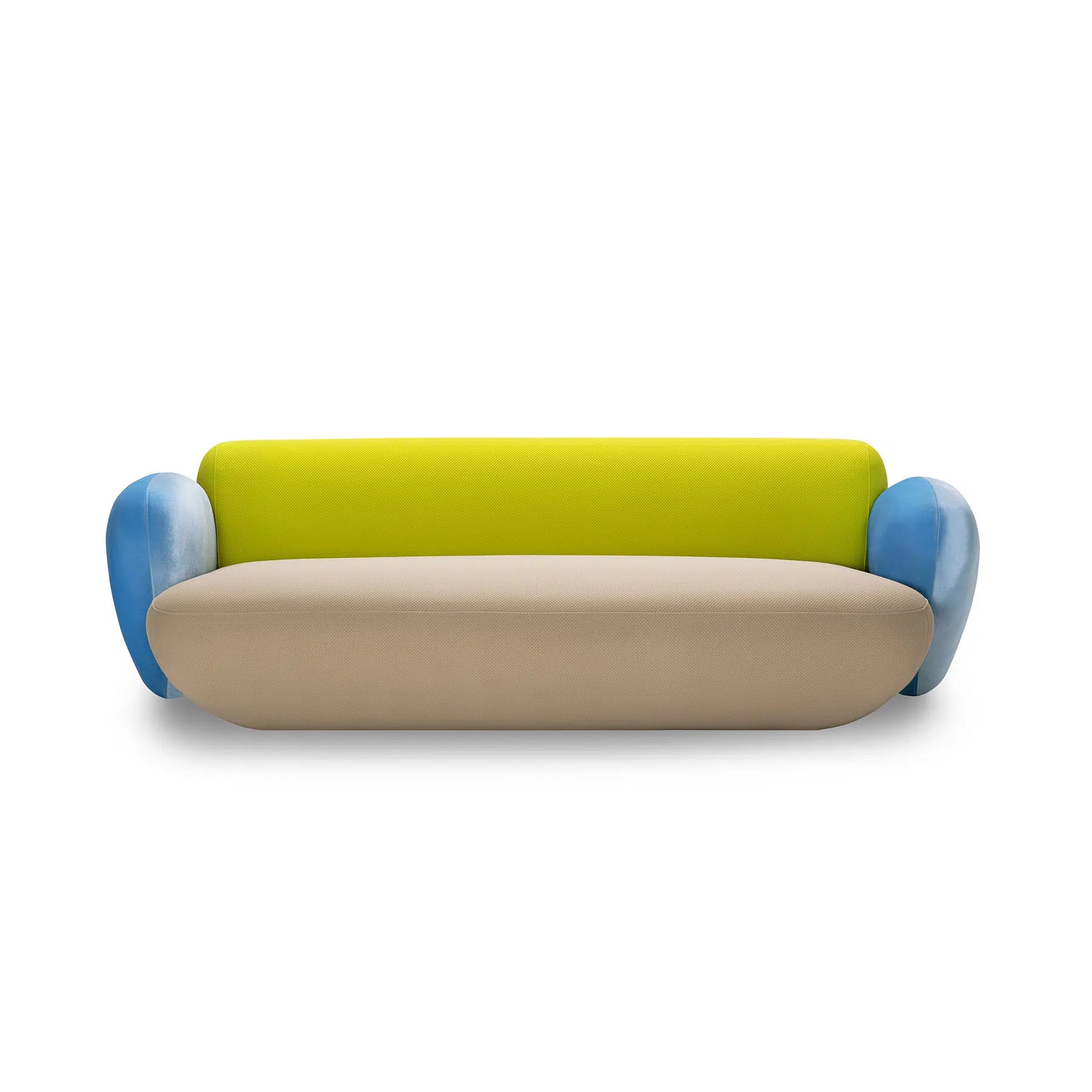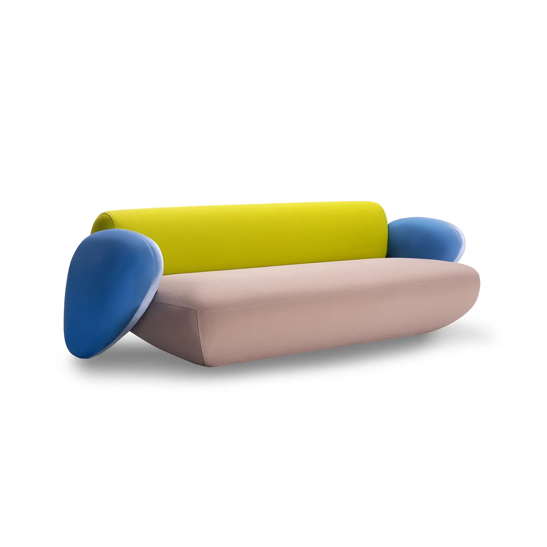 A sofa with a playful spirit and enveloping design. Its rounded shapes and generous proportions evoke polished stones. A pop wink that brings color, softness and comfort to any space. This product is offered in other finishes, and in fabric, leather or COM.