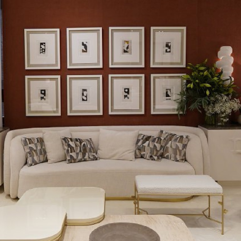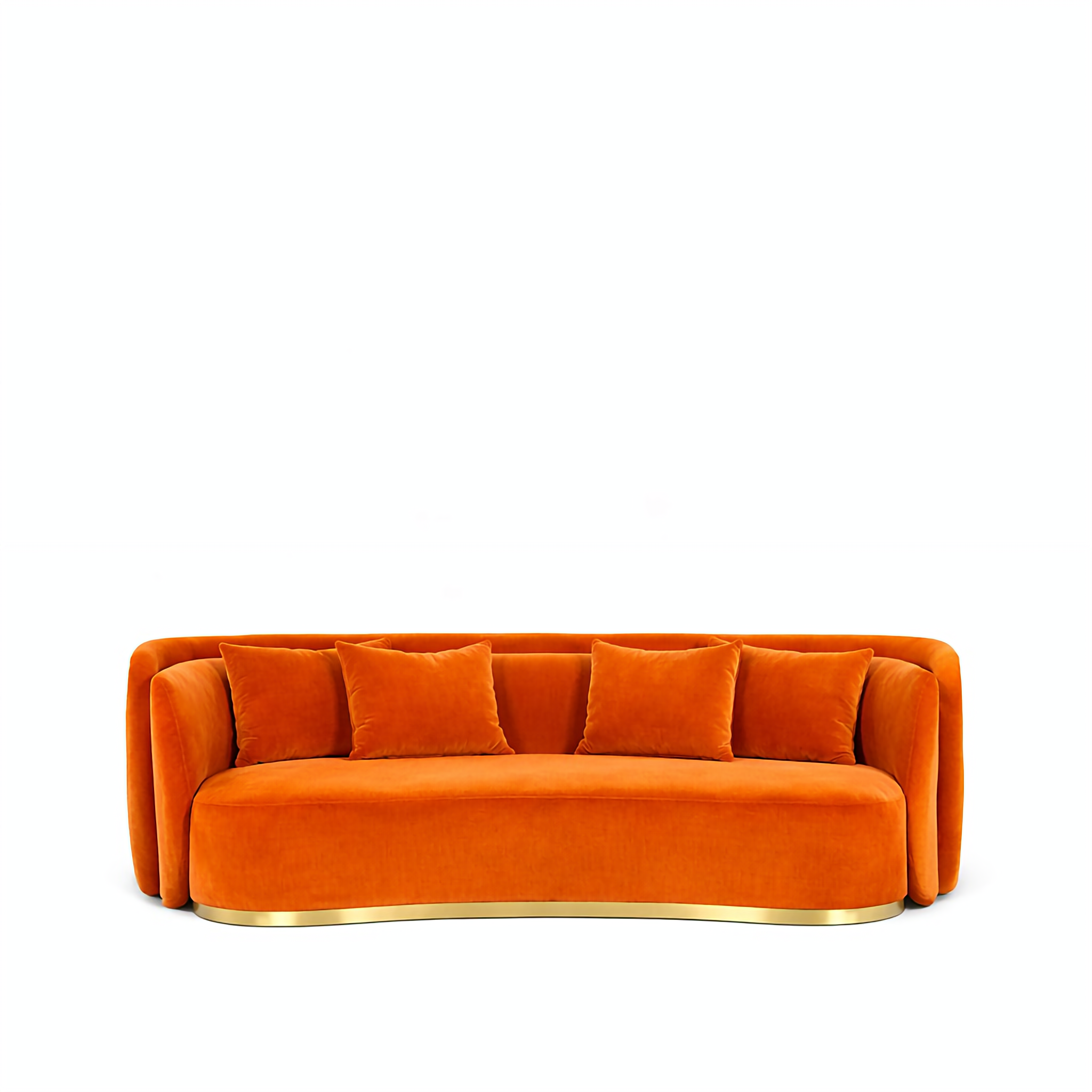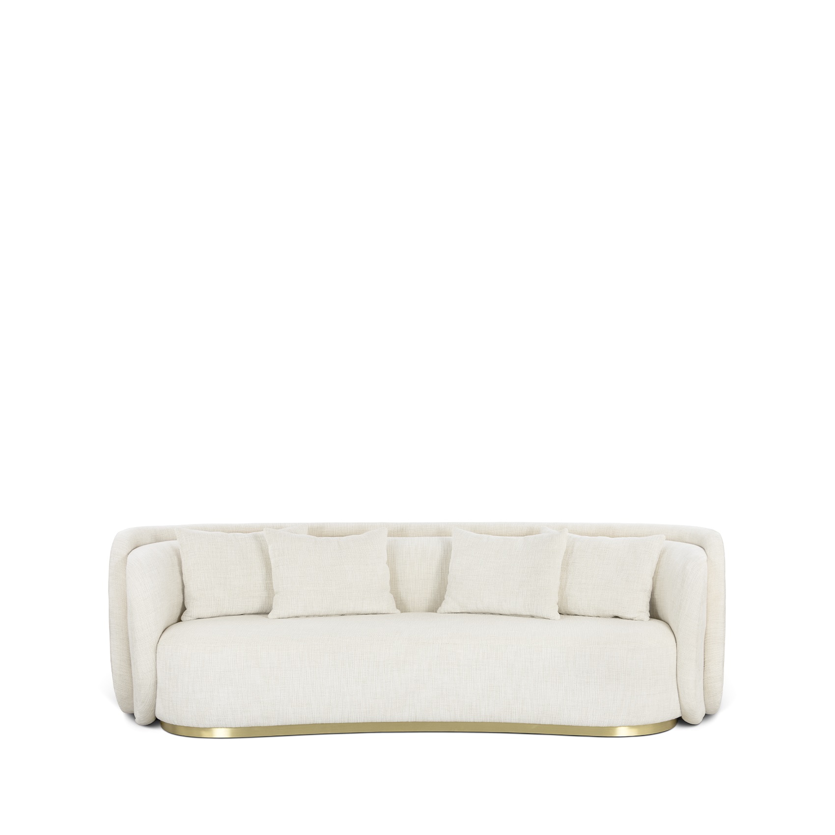 This striking and sophisticated sofa is a beautiful blend of comfort and modern design. It features a graceful, upholstered curved form that creates an inviting and fluid silhouette. The most distinctive element is the double back design, which adds a layer of visual interest and a sense of plush comfort. The entire sofa is elevated by a sleek brushed brass plinth at the bottom. This metallic base provides a sophisticated contrast to the soft upholstery, giving the piece a grounded yet refined presence.