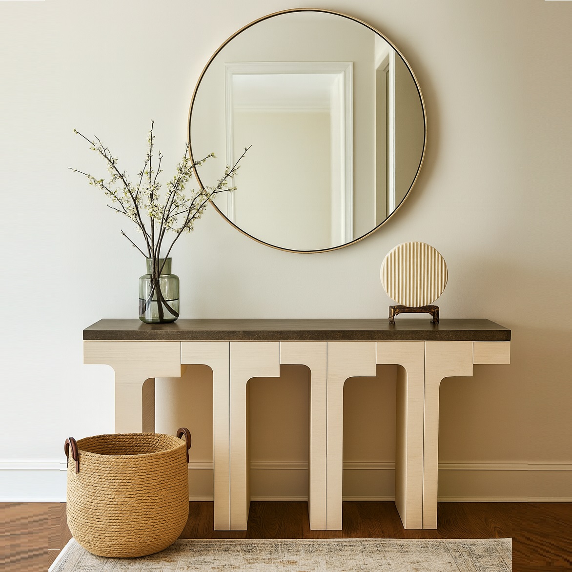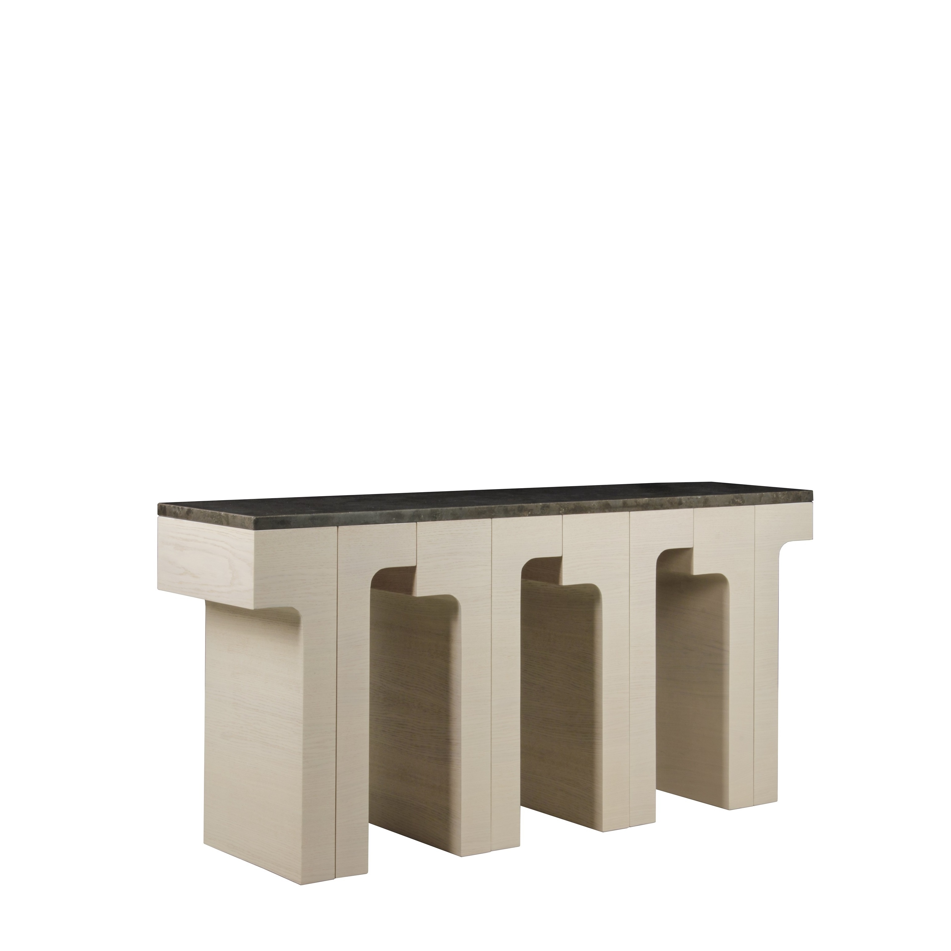This impressive and modern console table is a beautiful combination of natural stone and wood. It features a sleek, rectangular top made from Marron Vitta stone, which has a polished finish that enhances the stone's rich, dark tones and intricate veining. The table's substantial structure is crafted from oak wood and treated with a limed finish, giving the wood a subtle, whitewashed appearance that highlights its natural grain and adds a soft, textured contrast. The base is composed of a series of repeated arch-like forms, creating a strong, architectural presence. The harmonious blend of the cool, dark stone with the warm, light-toned wood makes this a sophisticated and timeless piece.