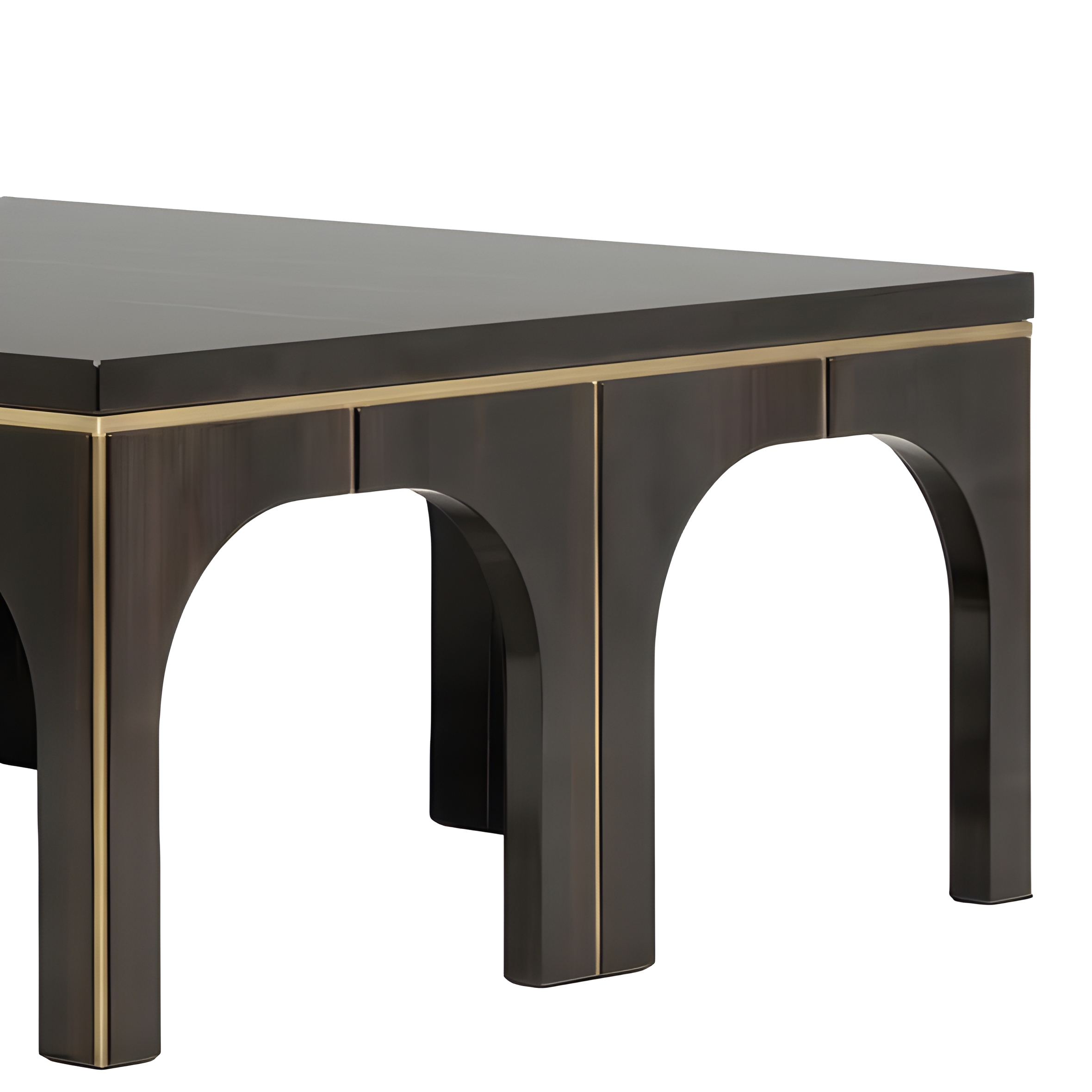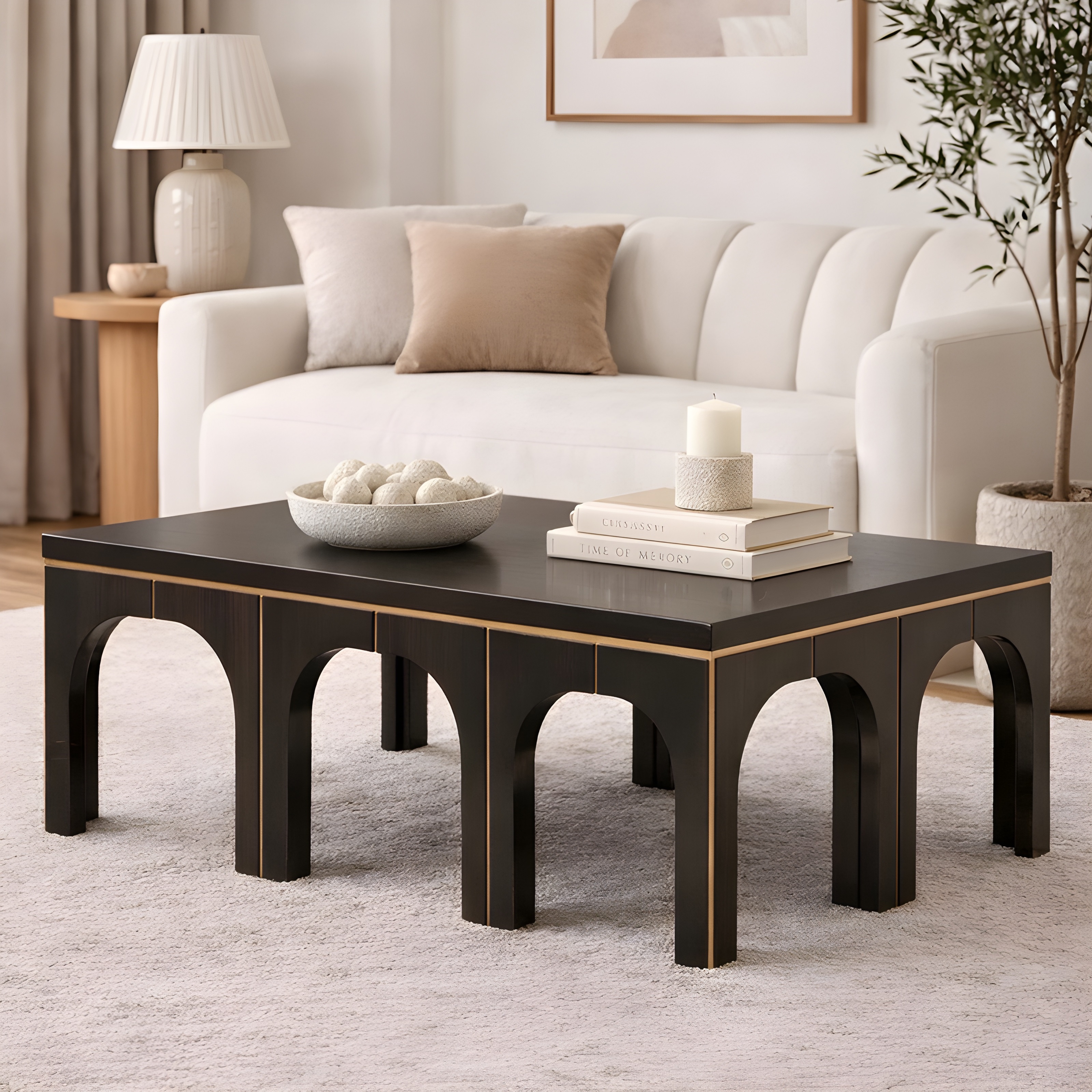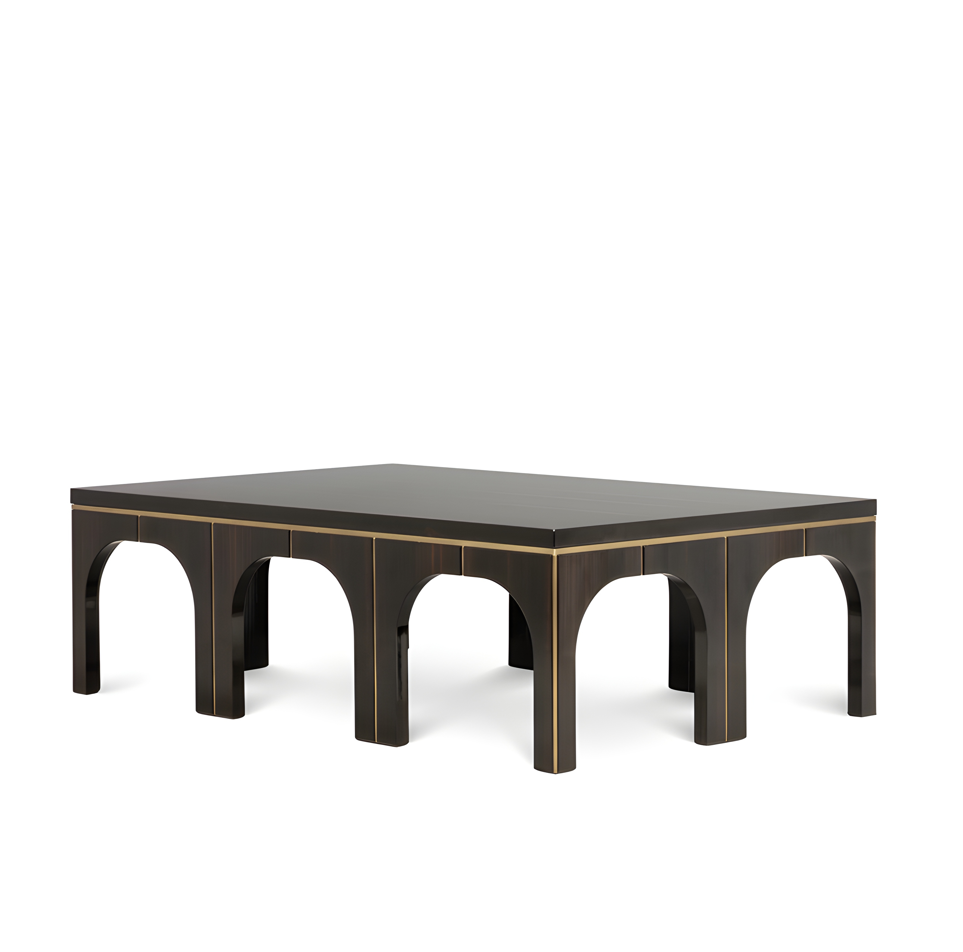 The Eneia Coffee Table is a striking fusion of contemporary artistry and Renaissance inspiration, characterized by its rhythmic rectangular form composed of ten meticulously crafted archways. Each arch is finished in a luxurious, high-gloss ebony wood and further elevated by the subtle gleam of oxidized French brass inlays. This sophisticated interplay between the deep, figured wood and the architectural metalwork creates a sense of sculptural harmony, ensuring the table commands a powerful yet refined presence in any modern interior.