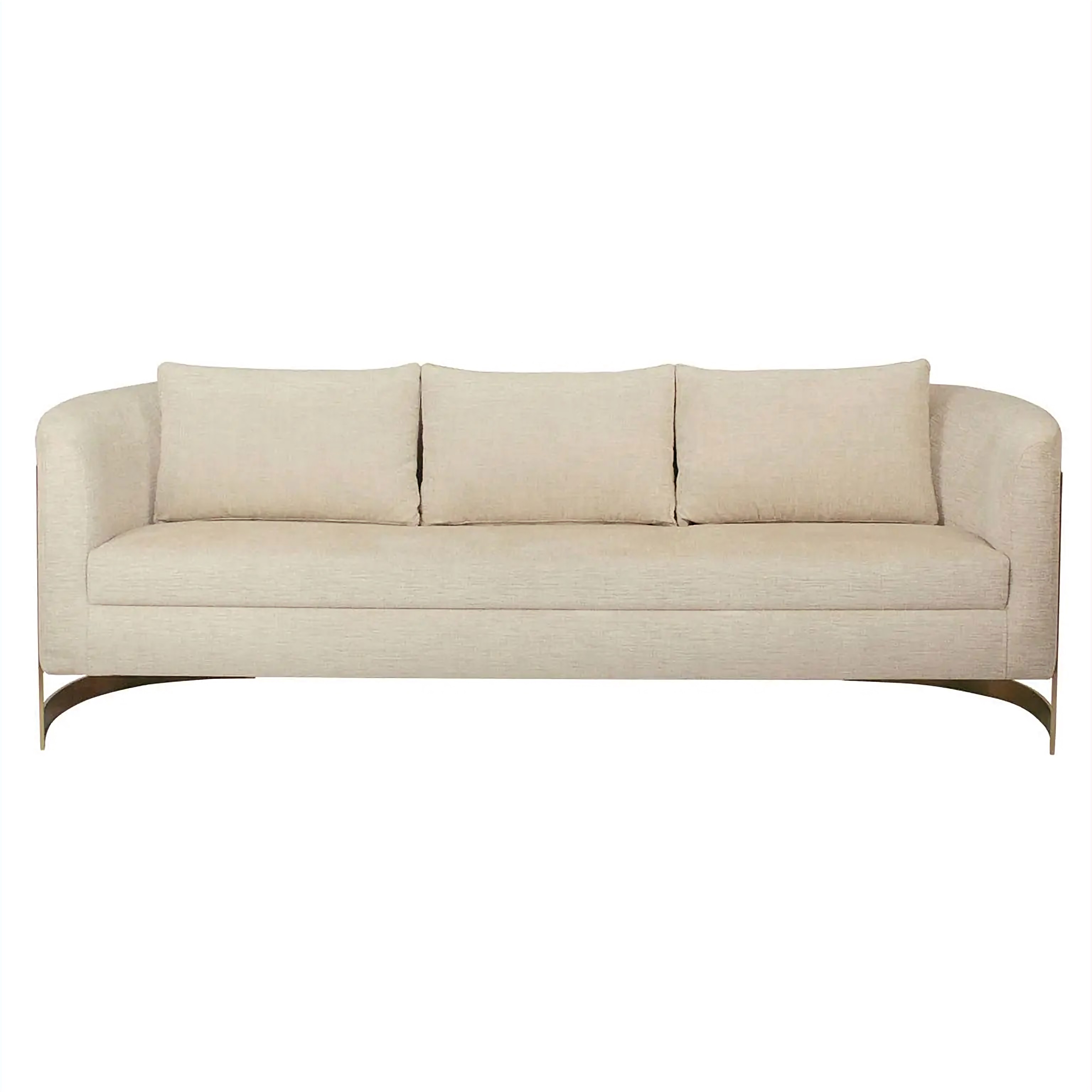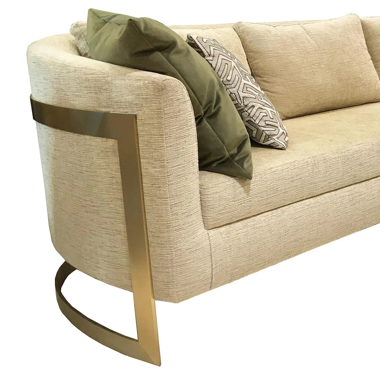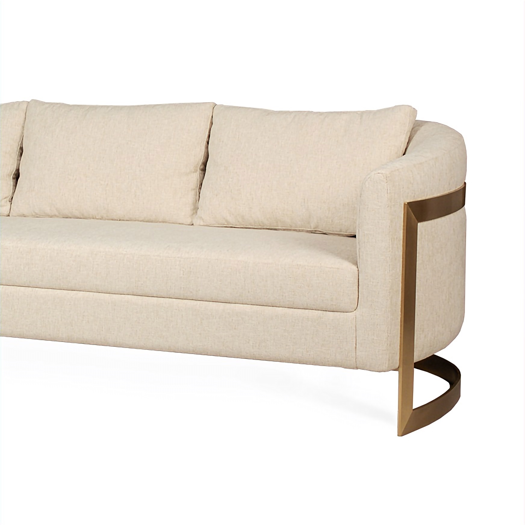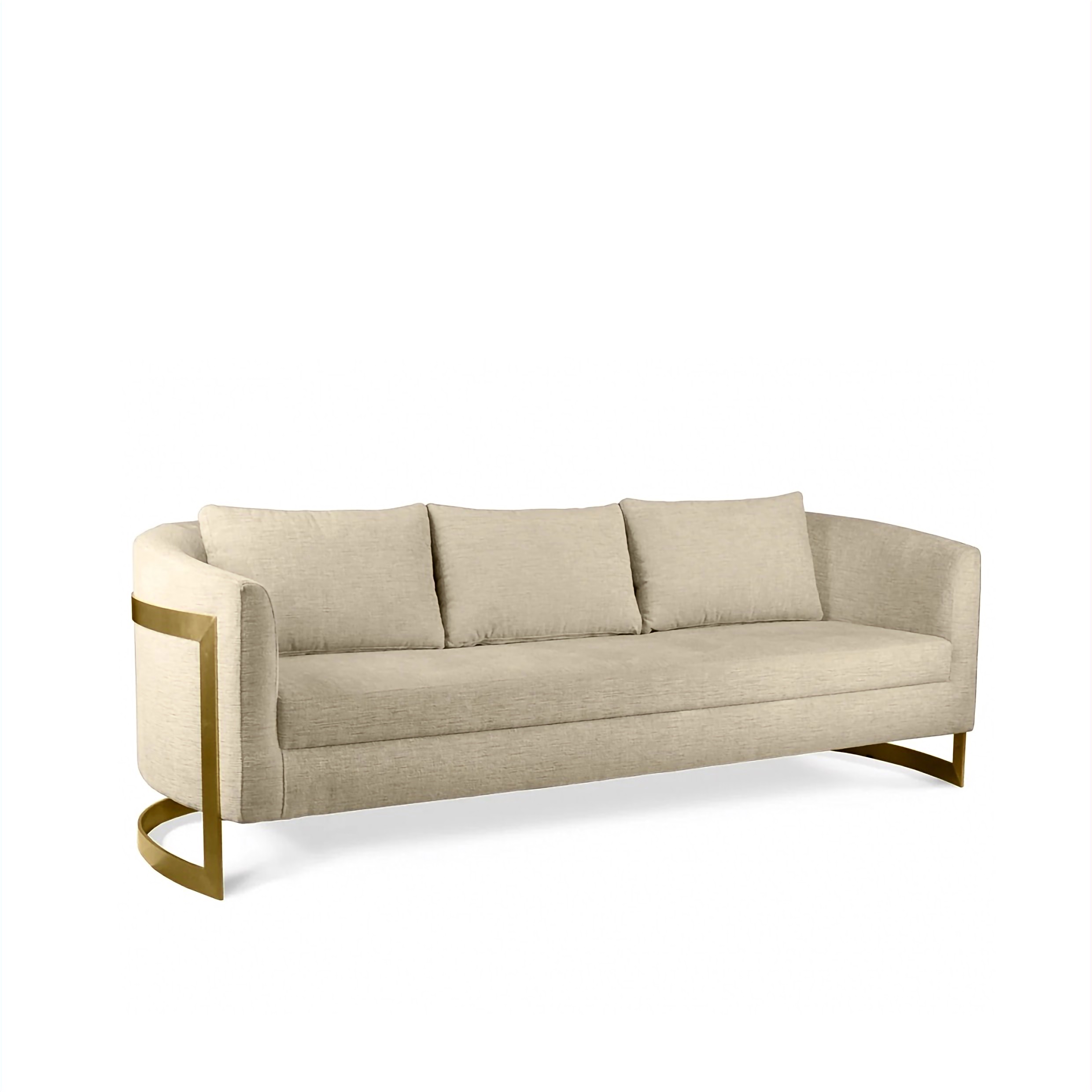 This masterfully crafted sofa balances organic softness with industrial precision. The deep-set upholstery is framed by a wraparound backrest, designed to cradle the body in a continuous arc of comfort. Its most distinctive feature is the curved brass leg structure, which transitions from the floor to the frame, clasping the armrests in a polished metal embrace. The warm glow of the brass against the textured fabric makes it a sophisticated focal point for any modern living space.