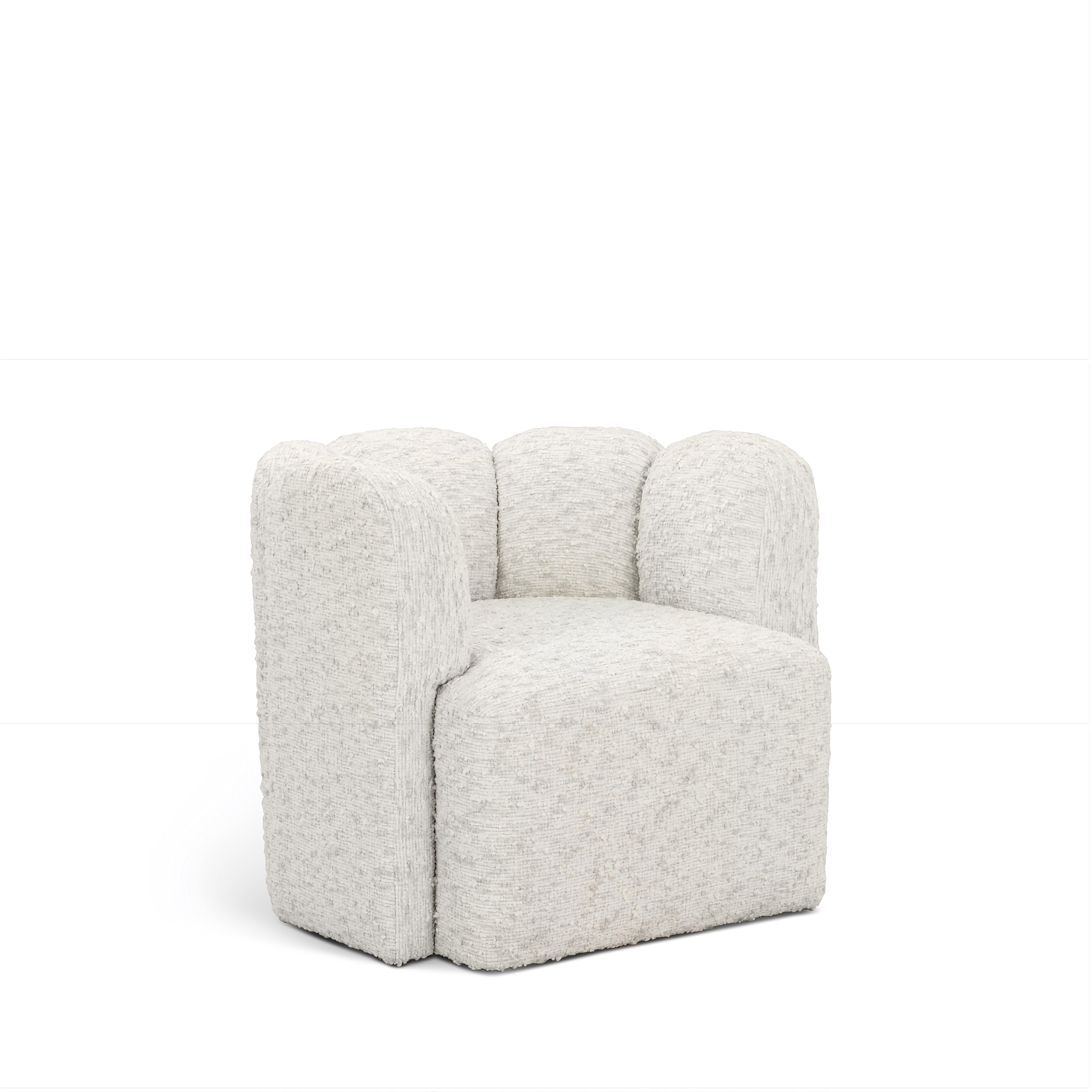 The Hopper Swivel Armchair is a contemporary masterpiece fully enveloped in a high-quality, textured fabric that emphasizes its soft, rounded contours and sculptural comfort. This sophisticated design features vertical channel-tufted panels that shape the backrest, creating a rhythmic, architectural look while offering deep, cushioned support. Its integrated armrests curve forward to provide an enveloping, private seating experience, all while resting on a low-profile base that lends a grounded, monolithic appearance. For added versatility in dynamic living spaces, an integrated swivel mechanism allows for a smooth 360-degree rotation, ensuring the piece is as functional as it is stylish.