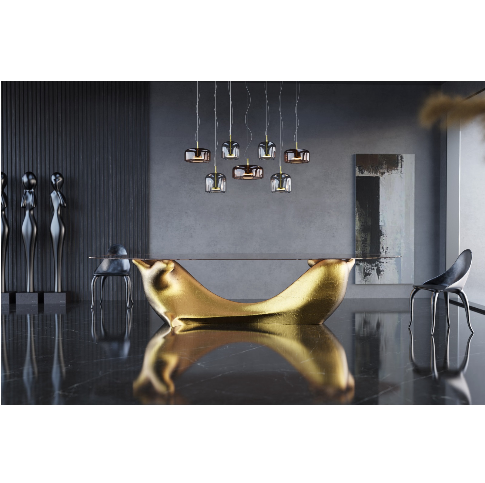 A true statement piece that embodies grandeur and elegance. Featuring a large bronze glass top, this table commands attention and adds a touch of glamour to any dining space. The sculptural base, finished with a lustrous gold leaf, showcases exquisite craftsmanship and serves as a captivating centerpiece. With its generous size, the Invicta Dining Table can comfortably accommodate up to 12 seats, making it ideal for lavish gatherings and entertaining guests.