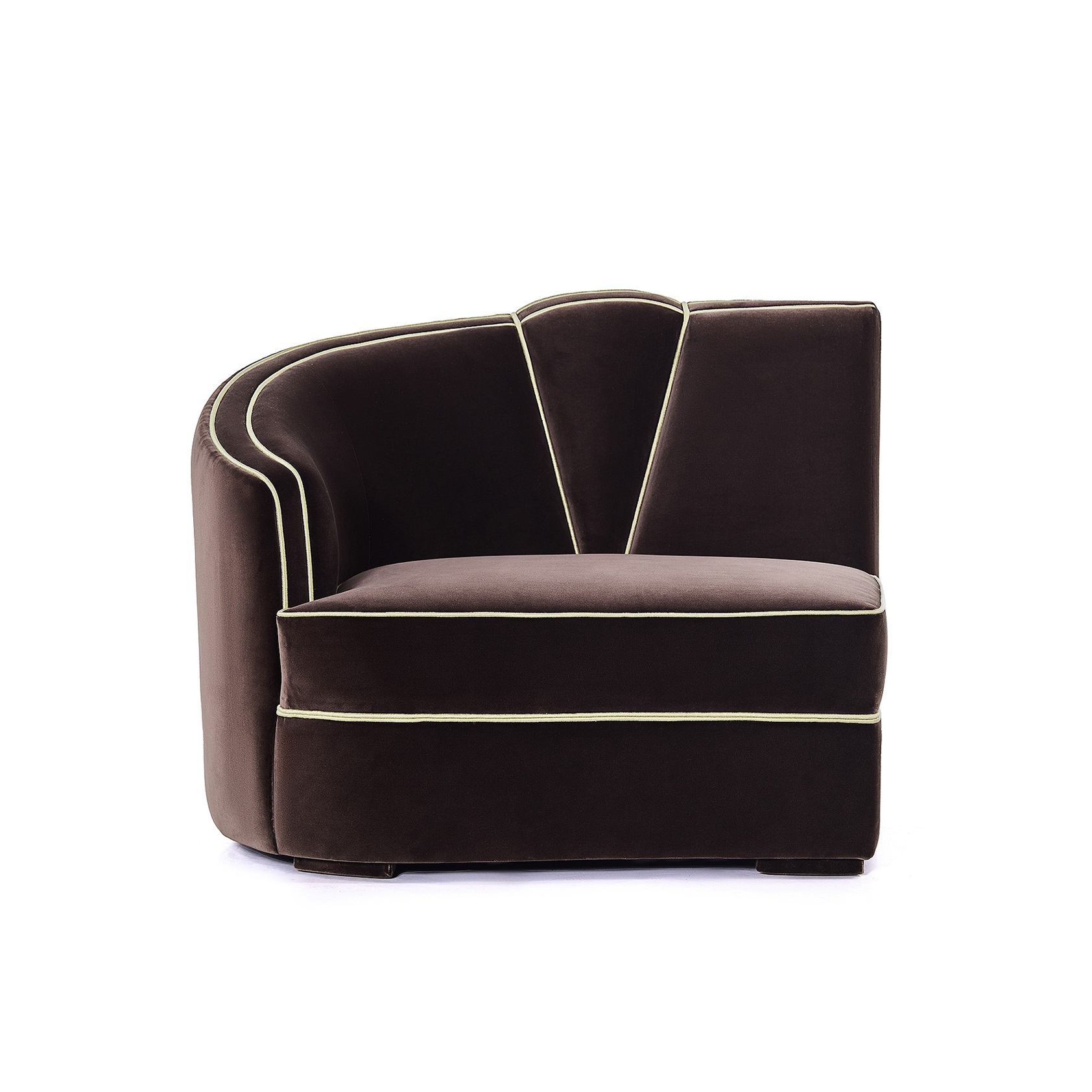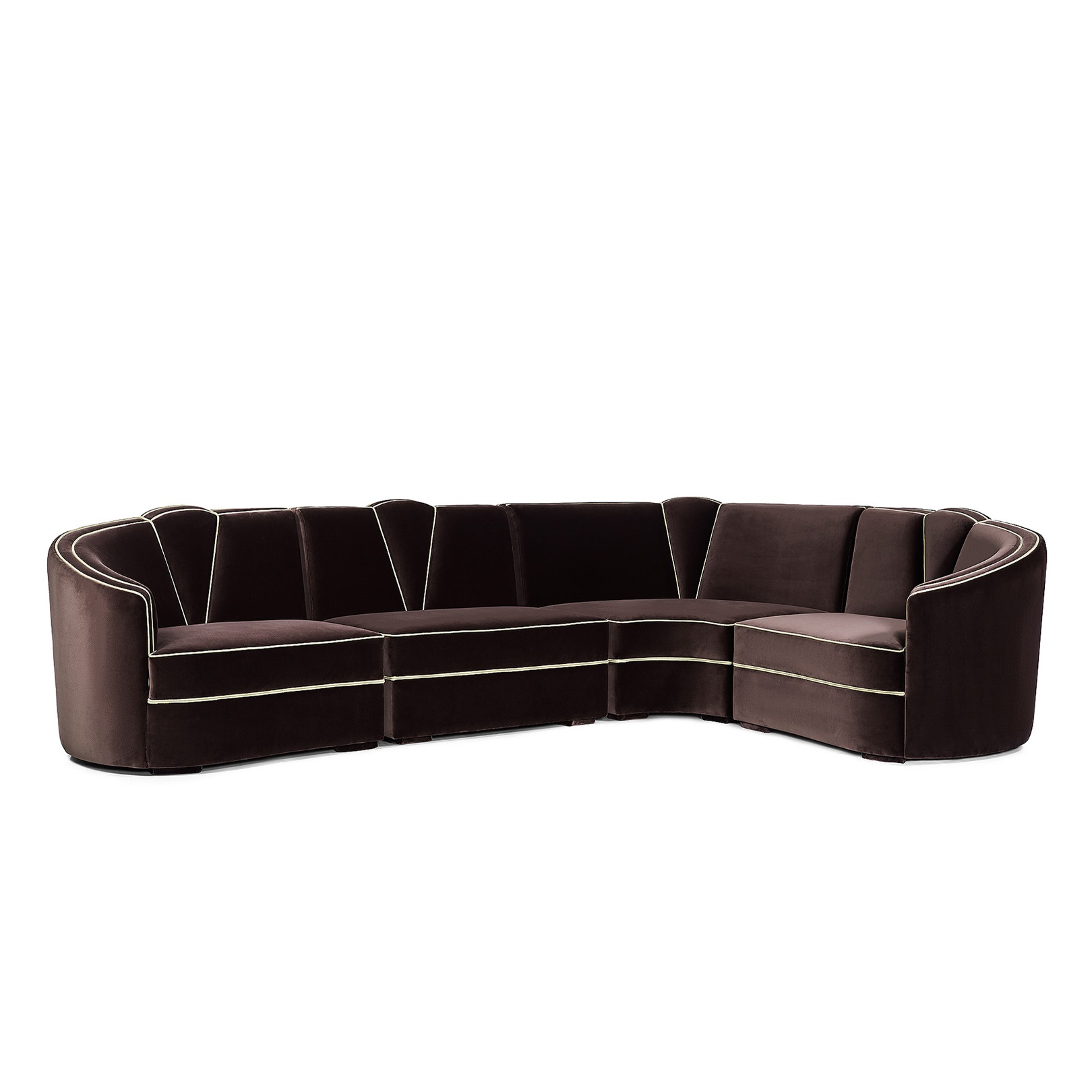 Channeling the aesthetic of the Art Deco movement, the Josephine Modular Sofa features a wonderfully elegant fan-shaped motif, with its accentuated curvy lines with decadent and lavish finish. The feminine curves are ravishingly enhanced by the different colored toned pipping.