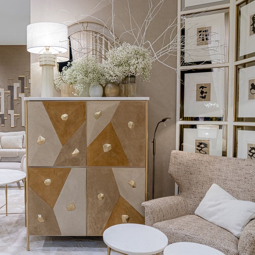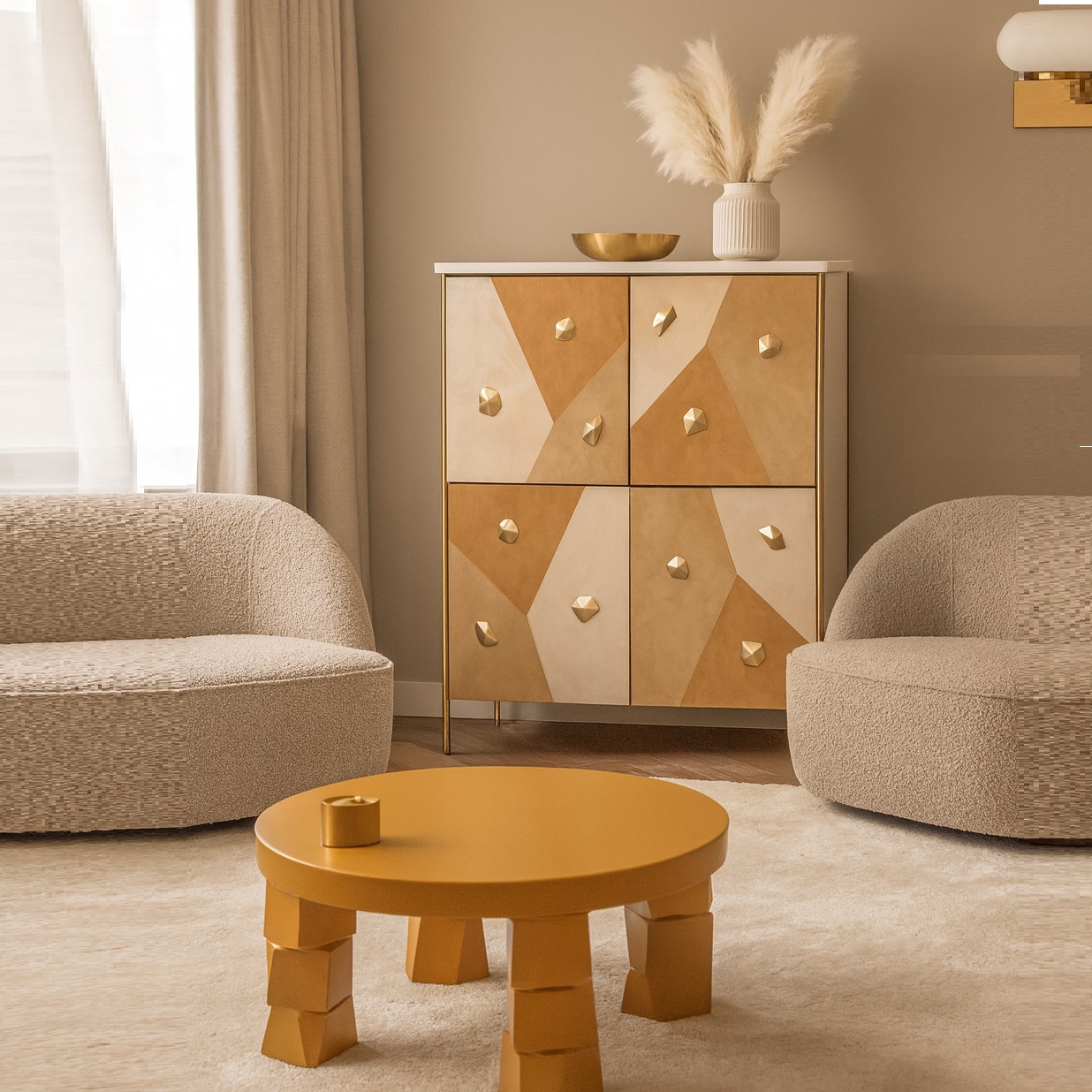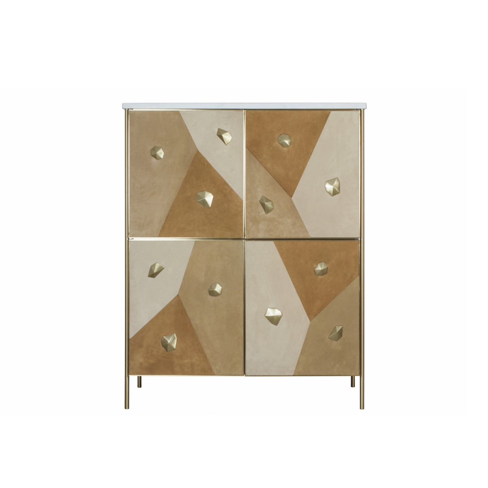 This sophisticated and artistic cabinet is a beautiful composition of contrasting materials and textures. It features a sleek top made from Estremoz marble, known for its elegant white appearance and subtle veining. The cabinet's substantial structure is crafted from oak wood with a natural limed finish, giving it a soft, whitewashed appearance that highlights the wood's grain. The front of the cabinet is a work of art, featuring four fabric-lined doors arranged in a geometric, asymmetrical pattern of contrasting tones. The piece is further elevated by unique, sculptural brass handles and legs with a brushed finish. The cabinet's interior is thoughtfully designed with a bronze mirror back panel, which adds a touch of subtle warmth and elegance to the storage space.