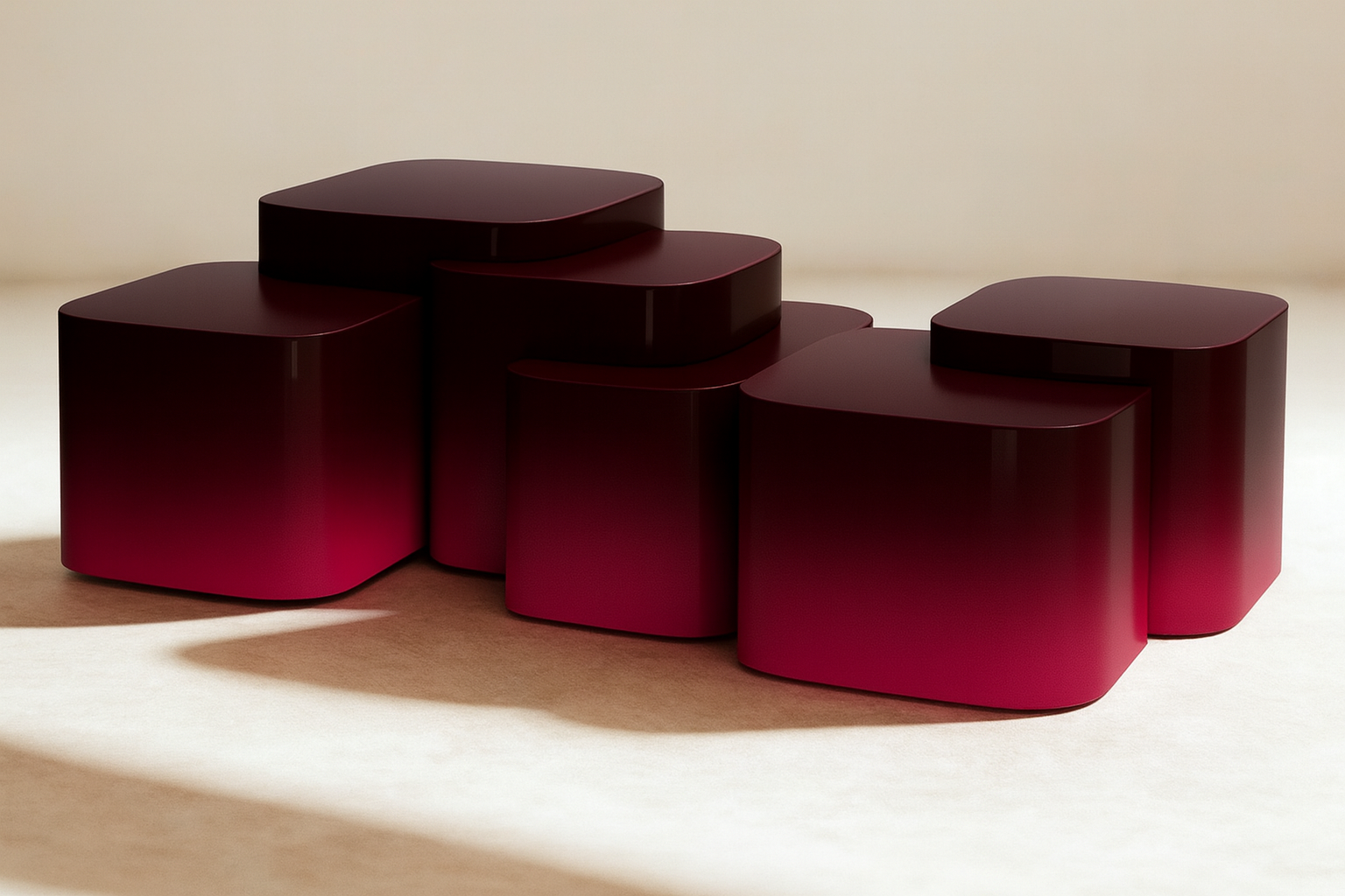 A rich palette of jewel and wine tones amplifies these powerful, sculptural shapes. Hues like Bordeaux and deep plum add audacious confidence, enhancing each piece by deepening its shadows and highlighting its form.