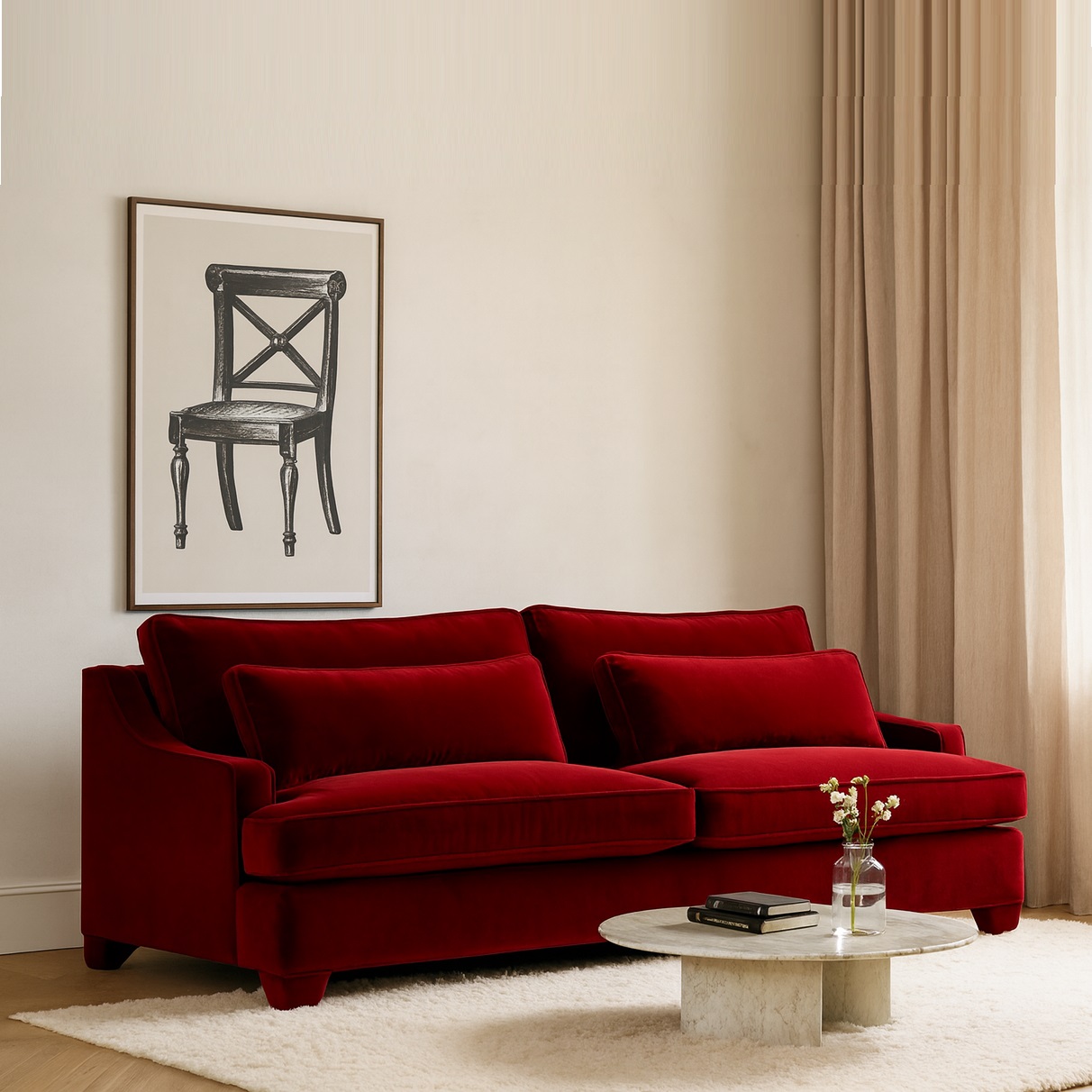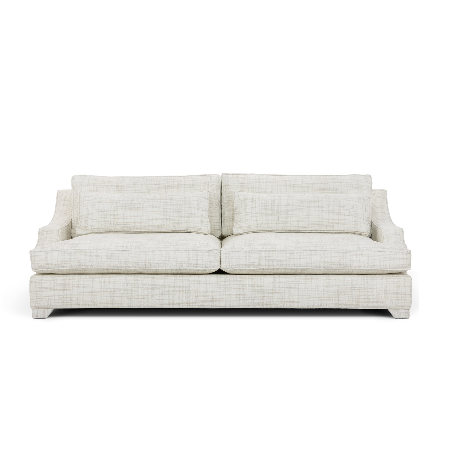 This comfortable and modern sofa is a study in streamlined design and understated elegance. It features a plush, upholstered seat and back, the contours of which are gracefully outlined by a simple piping detail. This piping adds a subtle but important element of definition, highlighting the sofa's clean, tailored silhouette. The entire piece is supported by matching upholstered feet, which seamlessly extend from the sofa's body. This cohesive design choice gives the sofa a clean, monolithic, and grounded appearance, creating a look that is both invitingly soft and beautifully modern.