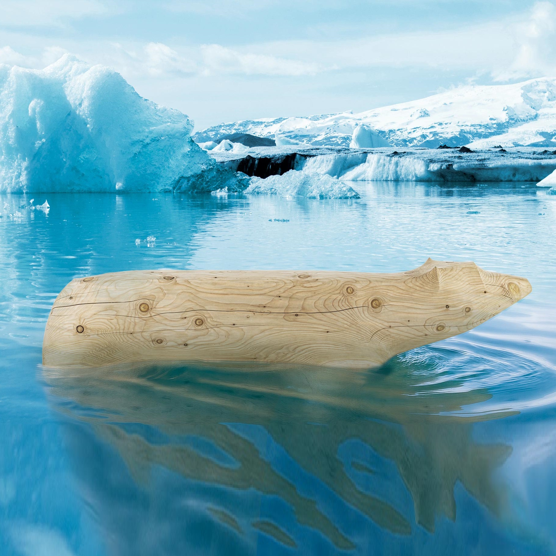 Crafted from a single block of solid scented cedar, this bench is a sculptural piece that evokes the form of a polar bear partially submerged in water. The design serves as a striking metaphor for climate change and its profound impact, merging natural materiality with powerful symbolism. Suitable for outdoor use with A7 cedar wood.