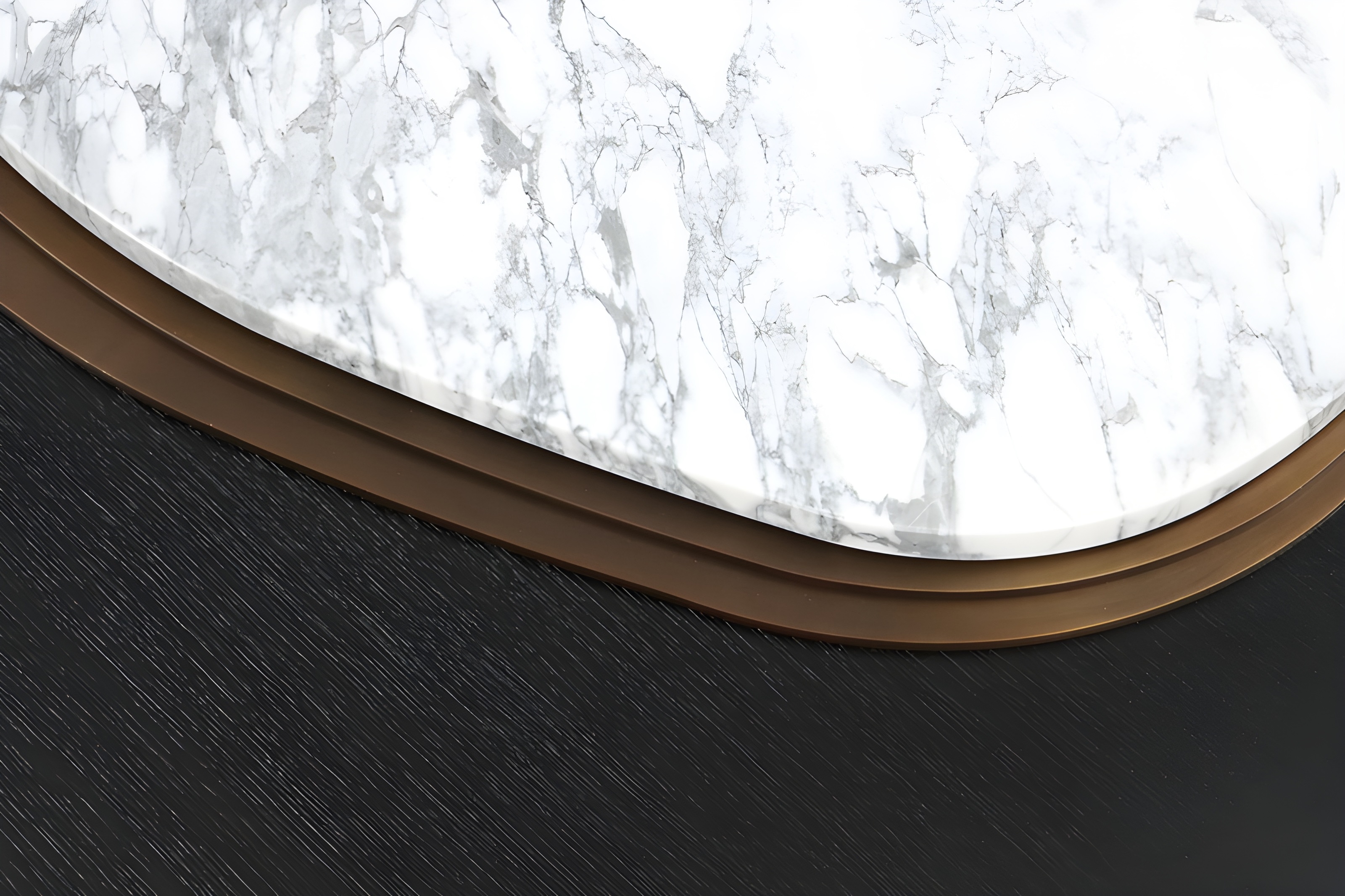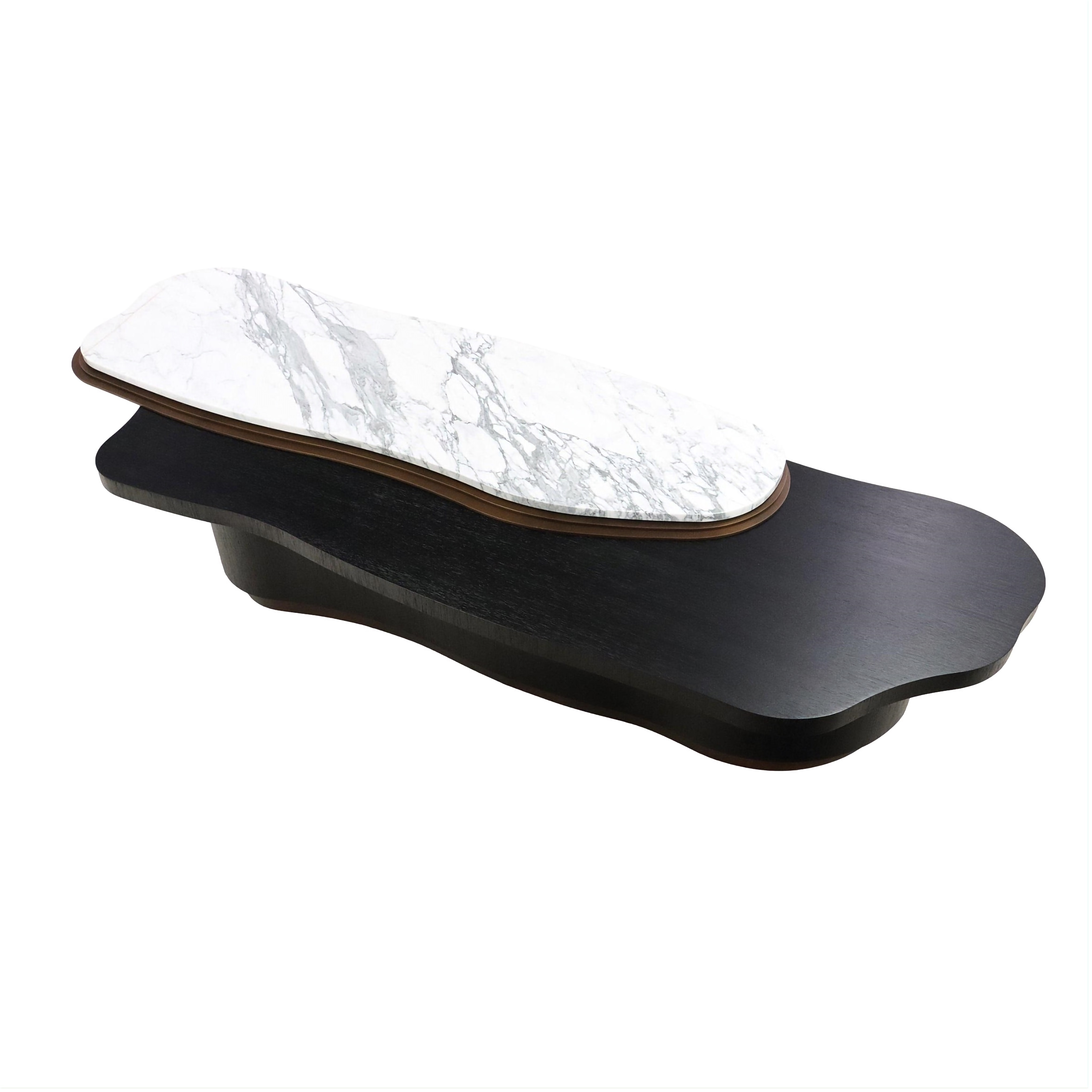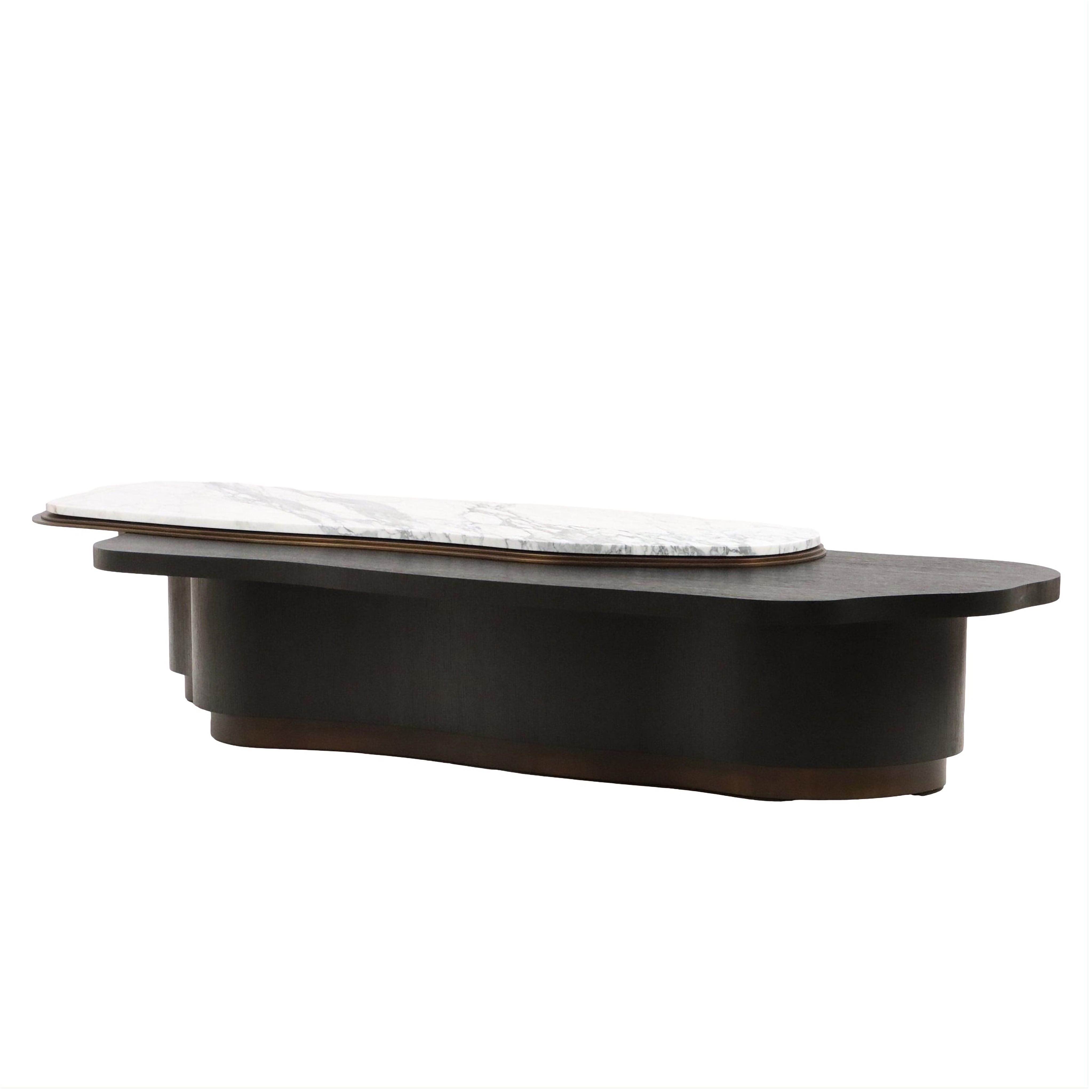 The Phoebe coffee table is a delicate study in texture and form. A rich natural ebony surface stretches beneath an island of oxidized brass and Marron Vita marble, their dark tones quietly converging in an elegant embrace. The smoothness of the marble and the warm sheen of the brass rise subtly from the deep, inviting wood, creating a serene focal point. Each material, with its own unique character, blends into a composition that speaks of quiet luxury and sculptural grace.