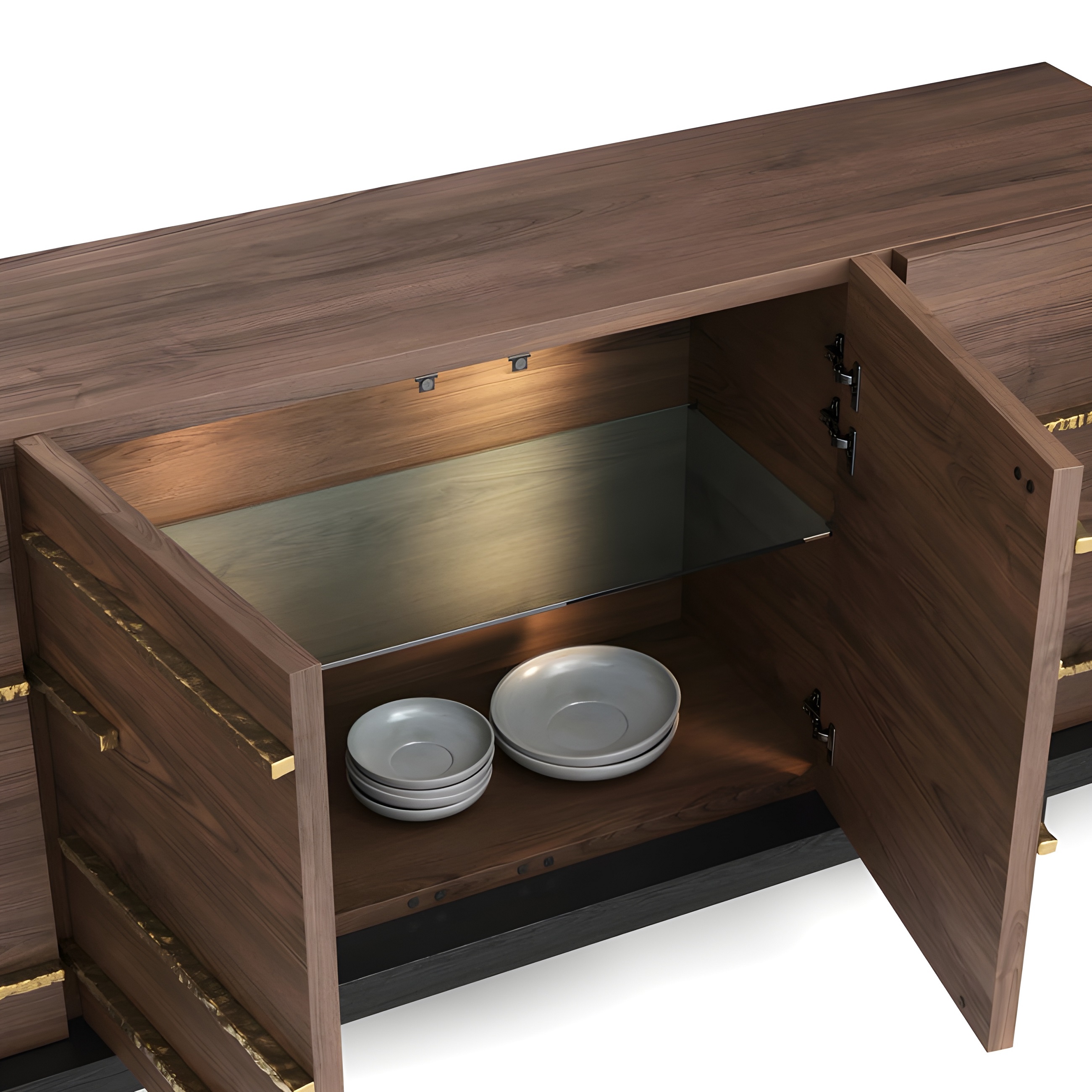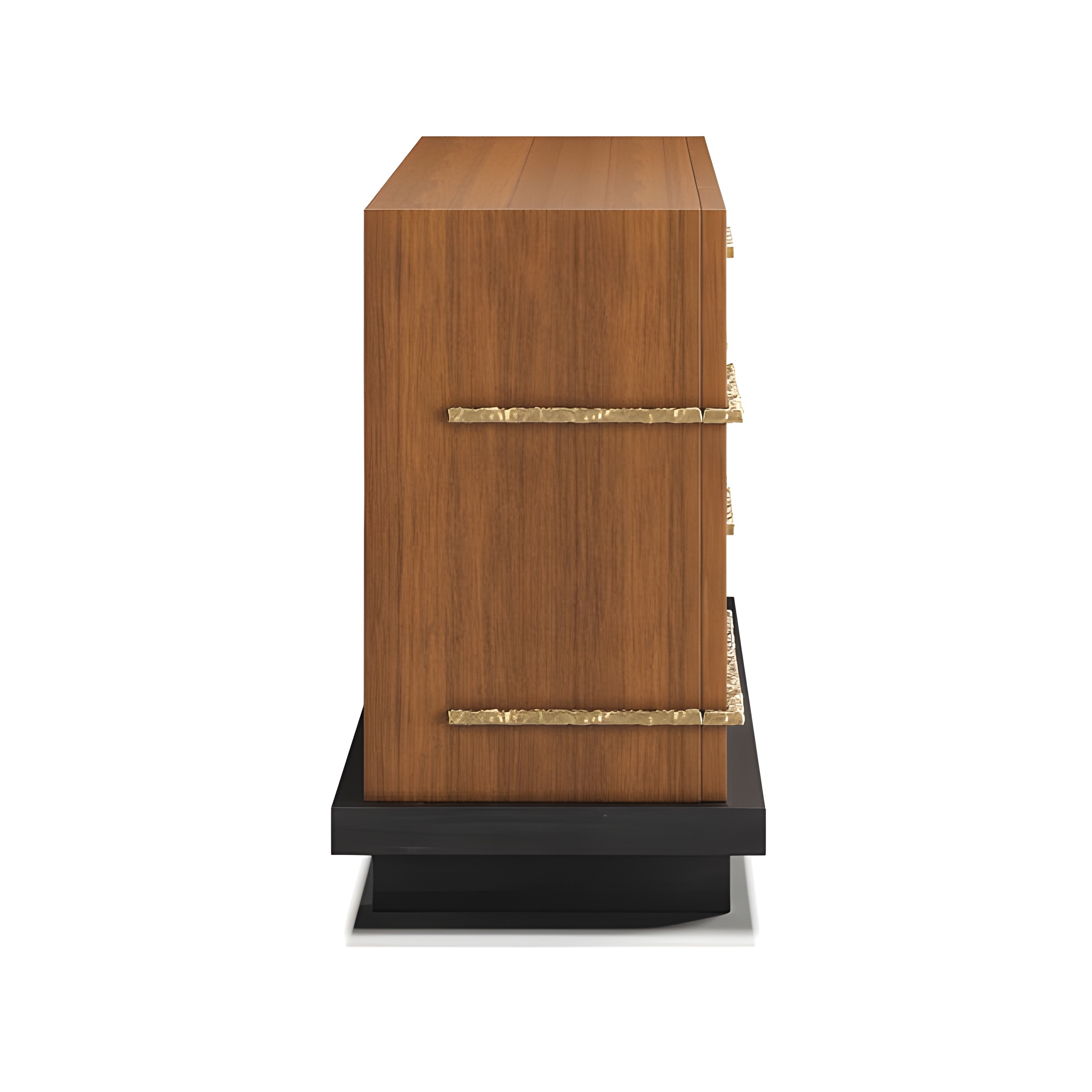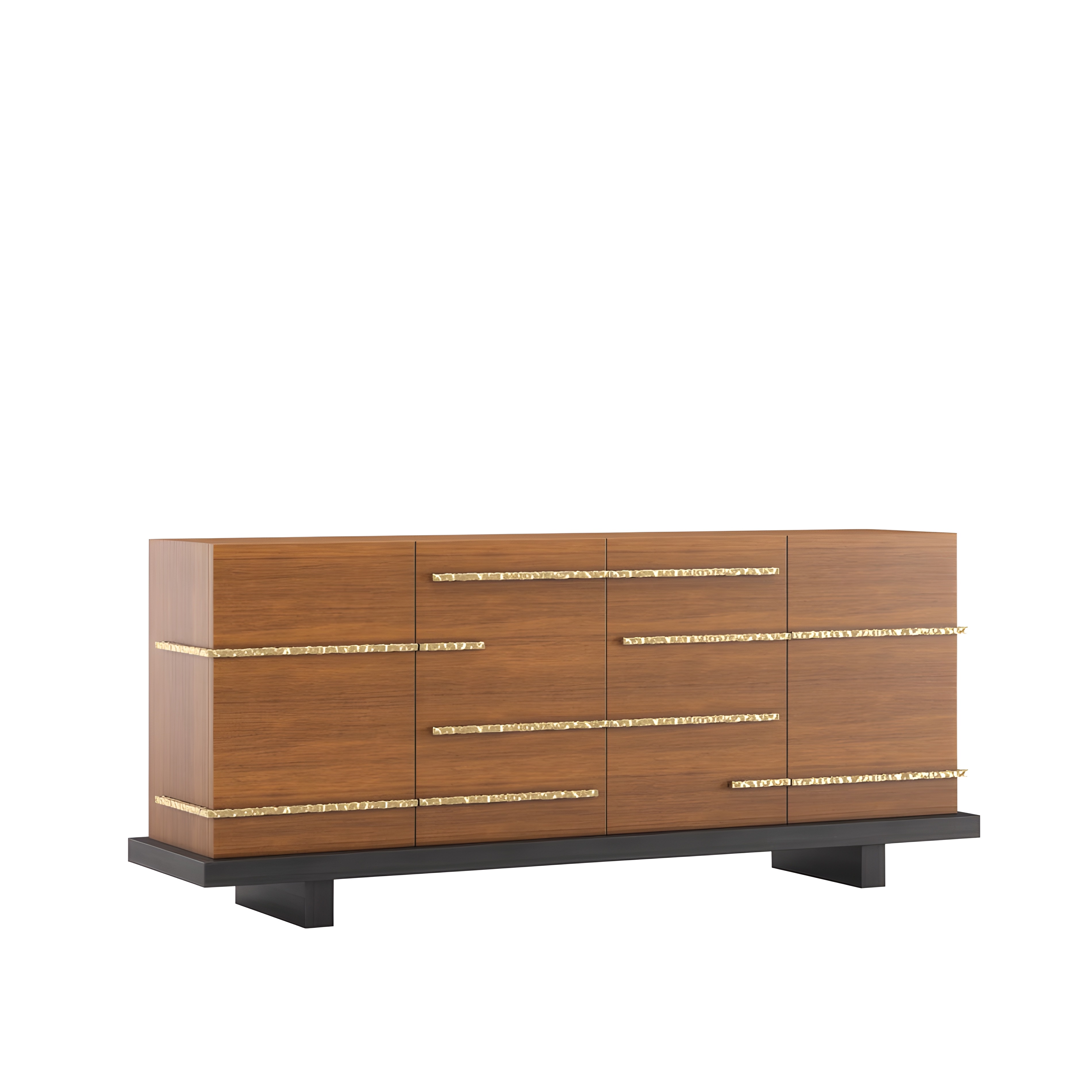 The Strata Sideboard reflects Sidani Design’s contemporary sculptural language — defined by architectural precision, refined geometry, and material richness. The piece explores the balance between linear proportion and tactile detail, expressed through warm walnut panels accented by hand-hammered brass bands that trace the form with subtle rhythm. Resting on a recessed matte-black plinth, it appears to float with quiet strength and modern poise. Designed and crafted in Portugal, this sideboard embodies Sidani’s vision of functional sculpture — a collectible piece that merges artful design and contemporary craftsmanship.